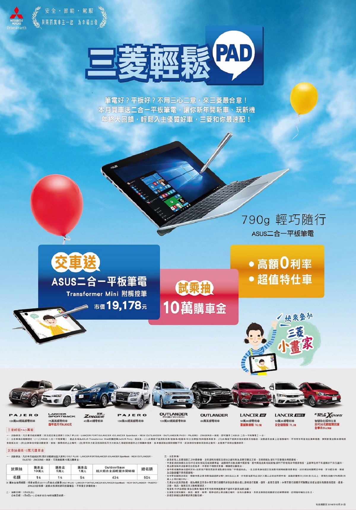 三菱輕鬆PAD 12月買車送您ASUS 二合一平板電腦 新春健診同步開跑 !!