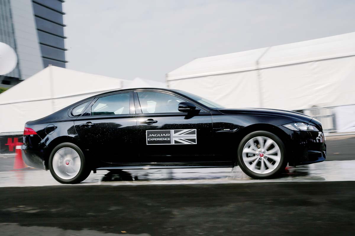 至於DSC動態穩定控制關卡則是讓大家了解DSC的作動時機與功能,原廠利用塑膠材質布料加上泡沫水打造出極為濕滑的路面,教練也表示其濕滑程度和冰面不相上下,用此來示範DSC對於現代車款而言究竟有多重要。首先筆者駕駛DSC系統關閉的XF在濕滑路面上進行全油門加速,但由於後輪幾乎沒有抓地力,車輛可以說是用飄移的方式前進,此時就算細心修正方向盤也很難控制車身動態;了解輪胎無限打滑的情況之後,教練便將DSC系統開啟,當系統發現輪胎出現打滑的現象後便會立刻作動,抑制動力的輸出讓車輛盡可能受控,筆者也能順利駛出國內僅有的一處「結冰」路面,也徹底認識到DSC的重要性及安全性。