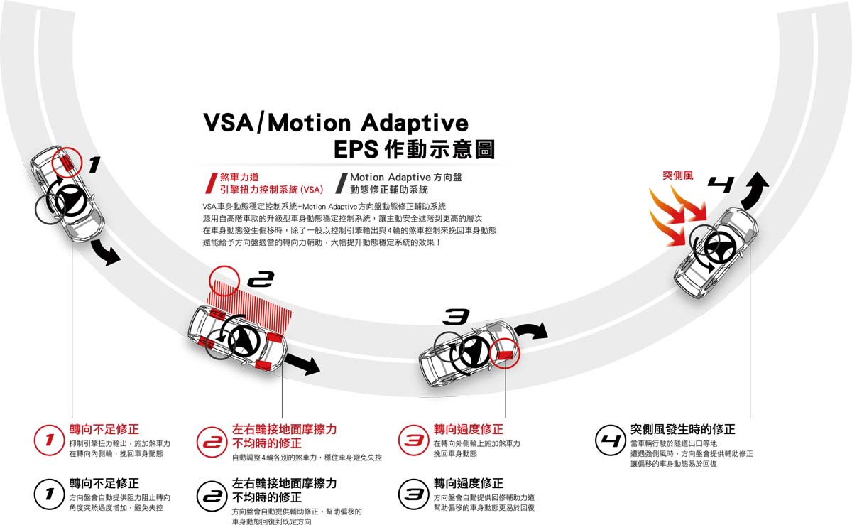 | VSA車身動態穩定控制系統,可當車輛失控時有效透過抑制引擎扭力輸出與施作煞車力於內側輪,保有行車安全路線。Motion Adaptive / EPS方向盤動態修正輔助系統則會於駕駛人為失誤或環境因素造成車輛失控時,自動介入方向機動力輔助,協助駕駛駛回正道。 |