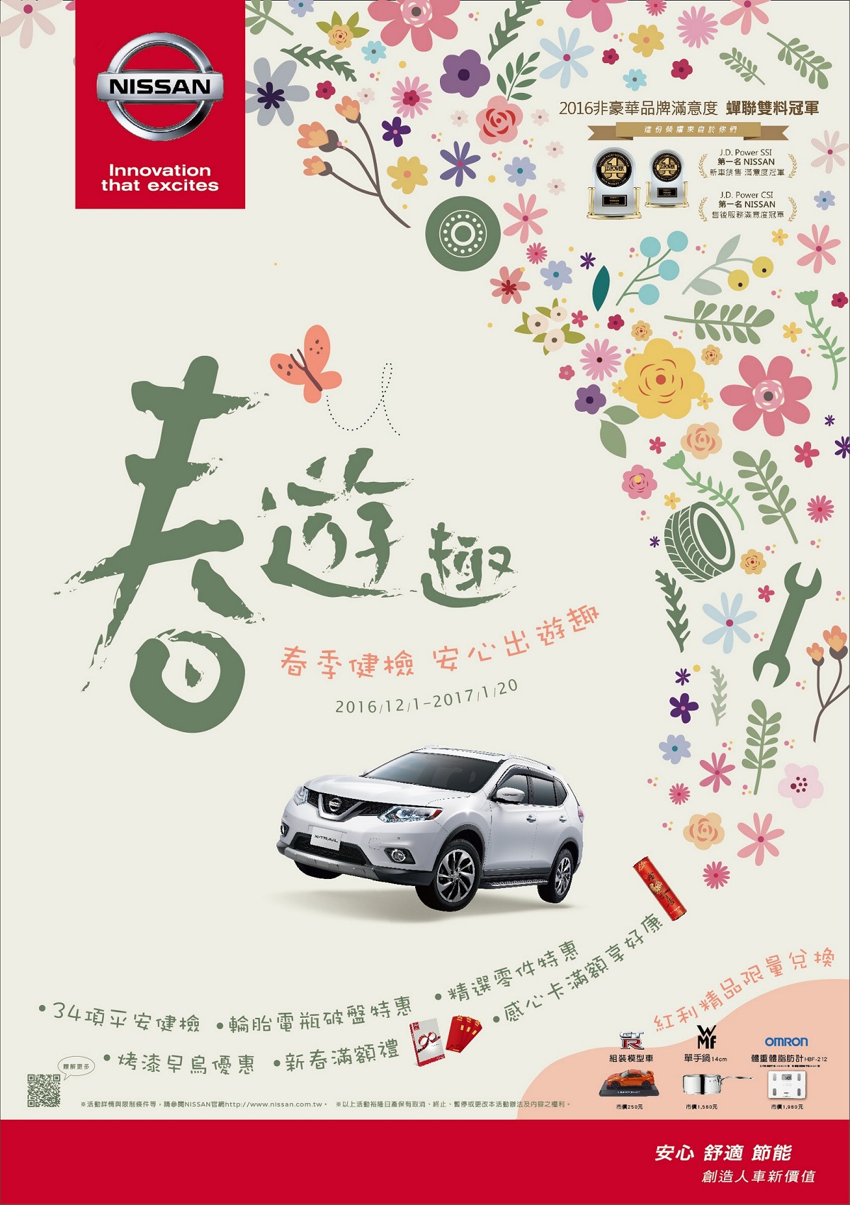 歲末時節將屆,為使所有NISSAN車主春節長假返鄉及出遊旅途平安,裕隆日產汽車自即日起至2017年1月20日止,正式推出NISSAN 2017「春遊趣」春季健檢活動,提供34項行車平安檢查,搭配精美滿額禮、全車烤漆、特惠零配件等多項優惠,NISSAN貼心提醒車主春節前回廠檢查,確保年節團圓歡樂時刻闔家平安。
