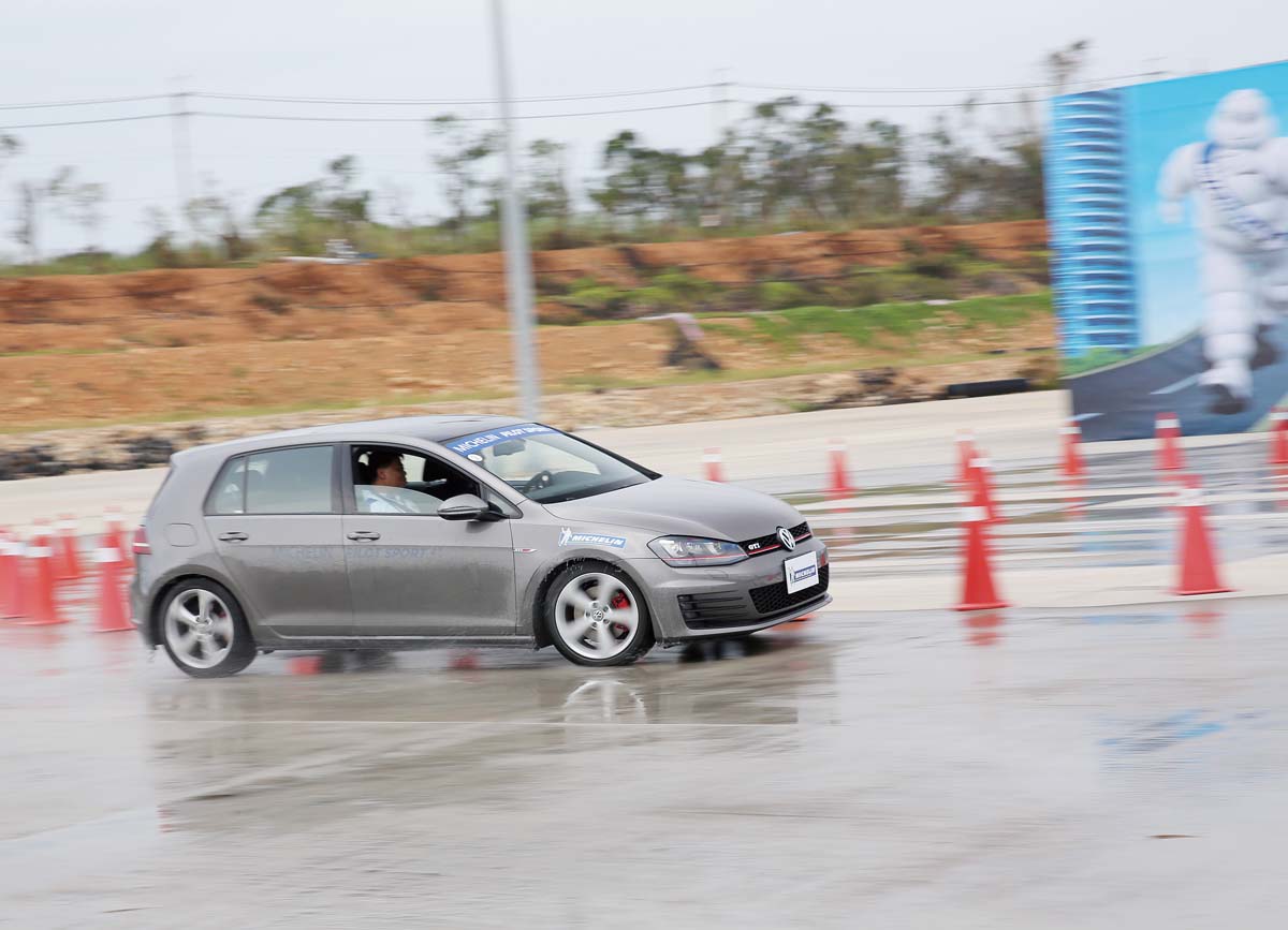 首先進行的是溼地繞圈的關卡,目的是體驗輪胎的轉向回饋性以及操控穩定性,測試車款是配置225/45R17的Golf GTI。在關閉ESP的情況下,以時速約40km/h的速度完成逆時鐘繞行4圈,之後則換上C牌競品的輪胎再開4圈。過程中確實可以明顯感受到Pilot Sport 4的抓地力能夠讓車尾保持在極佳的穩定狀態,但C牌競品則會在彎中發生車尾滑動的情況,以至於會想收油門放慢速度確保安全。當然對於較有操控底子的駕駛來說,車尾滑動的樂趣比較對味,但考量到一般多數駕駛的安全性,似乎高抓地力所展現出的穩定性會更佳。