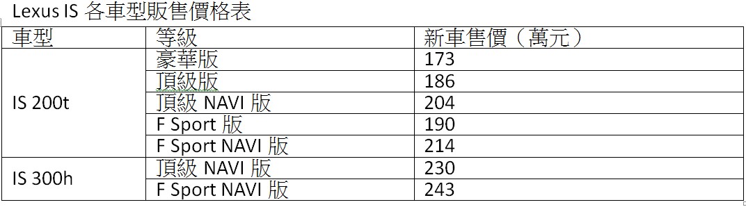 在國內頗受年輕中階主管客層青睞的Lexus IS車系,正式導入了小改款車型,此次改款重點著重在外型的修改及內裝質感的提昇,同時也將整合四大主動安全系統的Lexus Safety System +主動式安全防護系統納入全車系的標準配備中。而國內總代理和泰汽車亦調整了販售車型的編成,其中IS 300h乃取消了豪華版、頂級版及F Sport版等三款車型,僅保留了頂級Navi與F Sport Navi兩種版本;另外,IS 200t則維持原5款車型,不過受匯率及配備新增的影響,各車型的售價則有6~9萬元不等的調漲幅度。