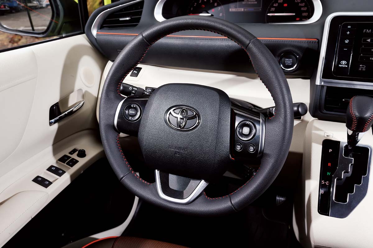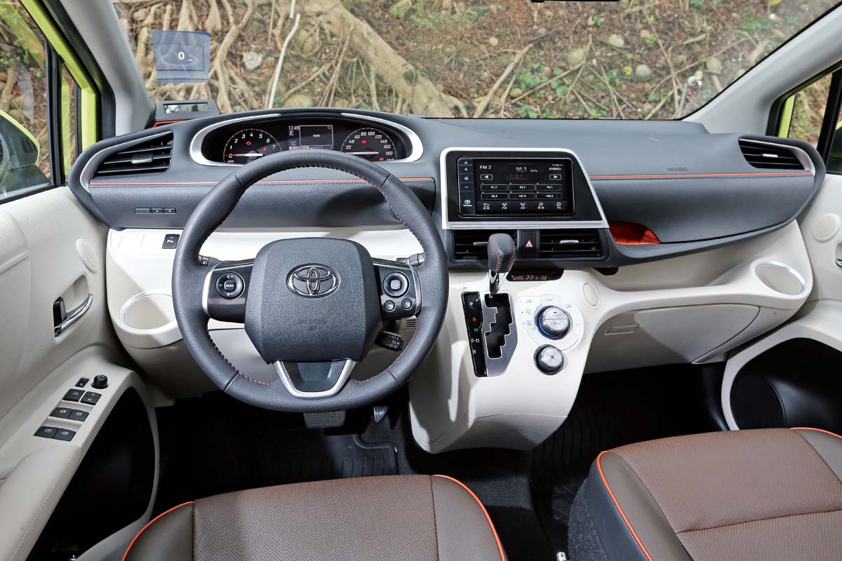 Sienta的內裝鋪陳設計有著Wish的風格,其排檔座皆採可增加腿部伸展空間的懸浮式設計,同時無論是中控檯、儀錶板與方向盤等鋪陳也以簡潔、操作便利的方式處理。不過整體造型少了些設計美感,個別看都具特色,但整合在一起就有說不出的怪。所幸原廠在中控檯及全車座椅加上橘色縫邊來營造年輕活潑的車室氛圍,這作法不錯有被吸引到,而中控檯依舊施以「塑膠車縫線」來營造視覺質感,不過這方式還是讓人感覺到塑感偏重了些,倒是門飾板與扶手處以皮革包覆,為車艙質感加分。配備部分,從右列各車型編成表來看頗有誠意,尤其安全配備的規格相當高,從5人座的1.8豪華車型開始即標配有VSC、TRC、DSC及HAC等九大主動安全配備,唯4具氣囊仍需加價選配。
