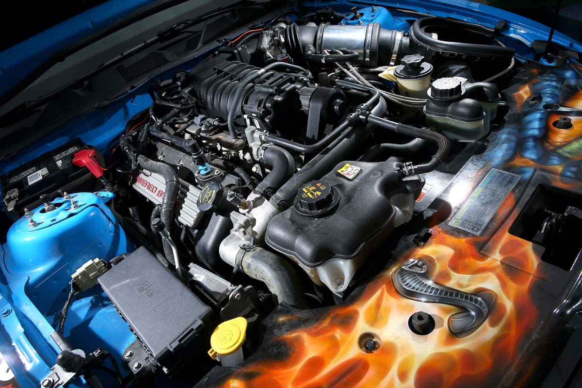 不過5.0升的大傢伙雖然總代理也有少數引進,但礙於台灣稅制導致能見度其實有限,而講到馬王大概就是在2007年式推出的Mustang GT500版本,當初Ford在打造這輛車時正好處於Ford設立100周年,因此在這個時空背景下,車輛的線條多半以懷舊復古路線為傾向,因此在這輛車上仍可看見不少當年野馬的風光偉業,打開引擎蓋那具令人津津熱道的5.4升V8 32汽門引擎,在原廠機械增壓的輔助下就能夠輸出500hp/66.4kgm的原廠實力。