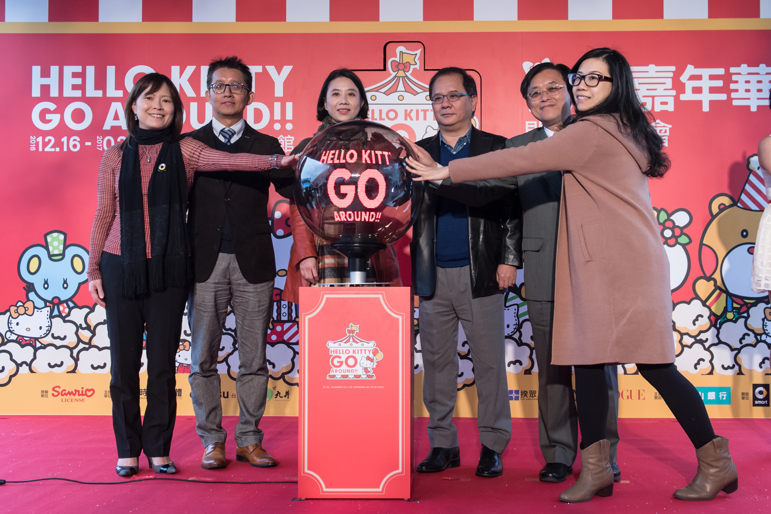 | 台灣賓士公關協理陳允若(左一)與三麗鷗代表以及其他贊助廠商共同啟動【Hello Kitty Go Around歡樂嘉年華】揭幕儀式 |