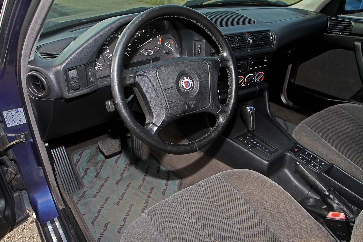 而據車主表示,這部車本身為四輪傳動車型,因此前避震器塔頂的造型與BMW E34車型完全不同,前懸吊系統的設計也差異頗大,另外動力方向機的構造也作了改變,使其轉向反應與路感更佳。打開車門,可以看到不論是門檻飾板或地毯上都有Alpina的字樣,中控檯下方也看得到Alpina的身分銘牌,且請車主將行照拿出來一看,其上所標示的品牌也確實是Alpina,而非BMW,雖已是半年內第二次接觸到Alpina的車款,但看得明明是BMW,實際卻不是BMW的感覺,對筆者來說還是相當特別,比接觸M-Car還要興奮,這或許也是BMW車迷喜愛Alpina的原因之一吧。