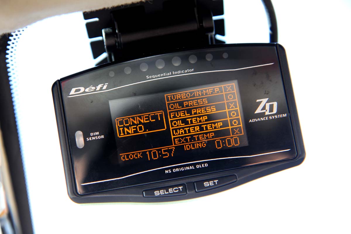 | 內裝也是低調到不行,幾乎保持原廠狀態,連變速箱也是4速自排設定,只在車頂加裝Defi ZD顯示儀錶來監控車況。 |