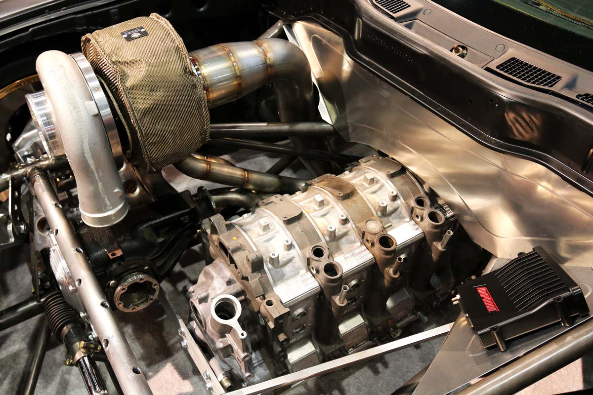 | 變速箱的位置很明顯可看到被鋼管覆蓋,四轉子搭配那具超大渦輪要突破1000hp也不會太難,搭配四輪傳動看起來應該就是直線式樣。 |
