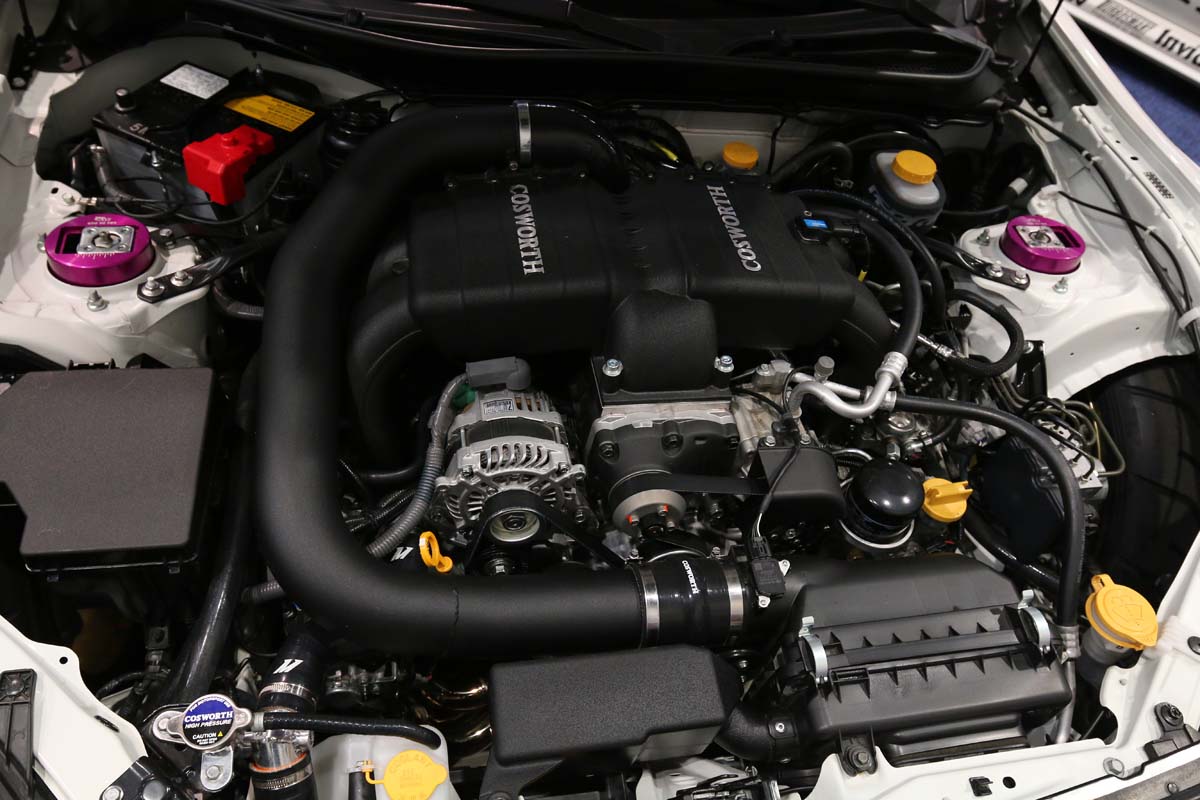 | Cosworth利用櫓式機械增壓器巧妙放在FA20引擎上方,不僅能能夠增加約90hp的馬力,整體完整性就像原廠車一樣。 |