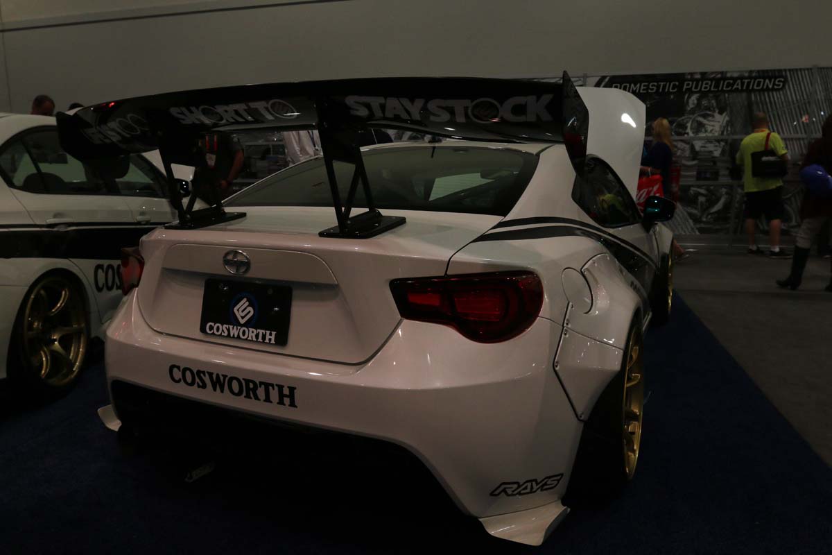 為此,知名的改裝廠Cosworth替這具FA20引擎提供五種不同幅度的升級套件,而最基礎的Stage 1.透過進排氣系統的強化,就可從馬力機上拉出40hp馬力提升,另外Stage 1.1-1.3則還可增加約20hp的效能,但是在Stage 2.機械增壓套件輔助下,透過精密計算將櫓式機械增壓器巧妙放在FA20引擎上方,此套件包含進氣歧管、Intercooler以及所有的固定架,再經過Cosworth重新改寫的ECU程式,最大馬力可提升70%左右,最大馬力可達289hp,效果十分顯著。此外,這輛Scion FR-S改裝了Rocket Bunny車身寬體套件,配合前保桿下方加裝有如鏟土機的下擾流板與大型定風翼,車頭穩定性瞬間暴增,而後下大型分流器結合GT尾翼,充分的下壓力肯定讓車輛穩穩貼在地面上。