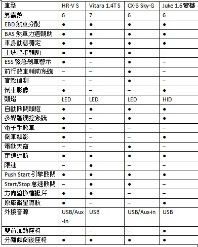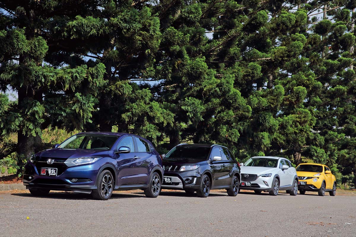 過往進口車就是給人安全與配備豐富的印象,但現今國產車不論在配備或是整體質感皆已有不輸進口的水準,其中HR-V在尚未駕駛前,座艙規畫讓人在第一眼留下好感;Vitara從務實的格局鋪陳可以想像到仍以操控或越野作為訴求。CX-3不論在外觀或內裝都顯示出想極力討好每個消費者的喜好胃口;至於Juke從裡到外獨特的設計無不讓人與性能聯想。