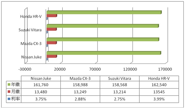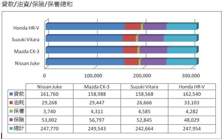 經過各項成本加總後,最終Vitara在各方面皆有較為親民的成本費用而勝出。首先從貸款方面來看,Vitara與CX-3因利率較低進而讓年度省下約3,000元;油耗部分可以看到小排量渦輪的優勢,18km/L的表現讓Vitara在這項目大幅降低費用,與HR-V甚至有著約6,000元的差距,也是讓Vitara勝出的重要關鍵。而每2萬公里的保養則輪到Juke展現優勢,儘管身為進口身分卻有最便宜的保養費用,至於其他三位對手彼此間有沒有太過誇張的差異,至於保險部分,CX-3在各項費用都不算高,但因稅金緣故而導致整體費用增加,HR-V則憑藉較為便宜的車體險費用,得以降低整體保險成本。