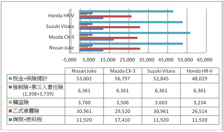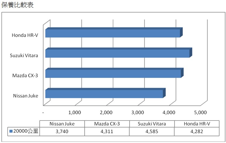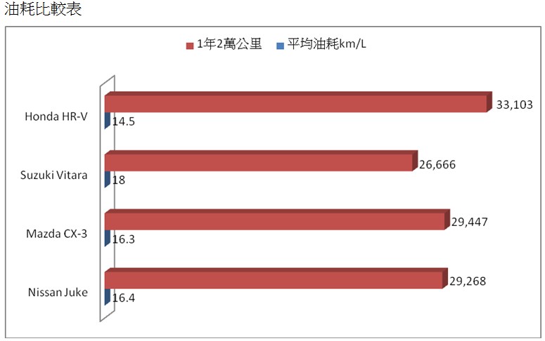 | 註:油資=20000公里/平均油耗×每公升(中油牌價95無鉛汽油24元)。 |