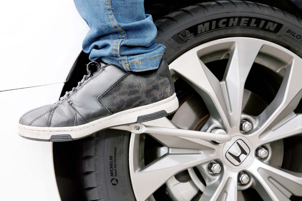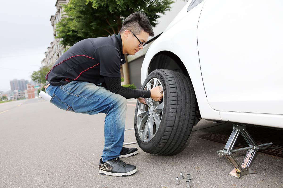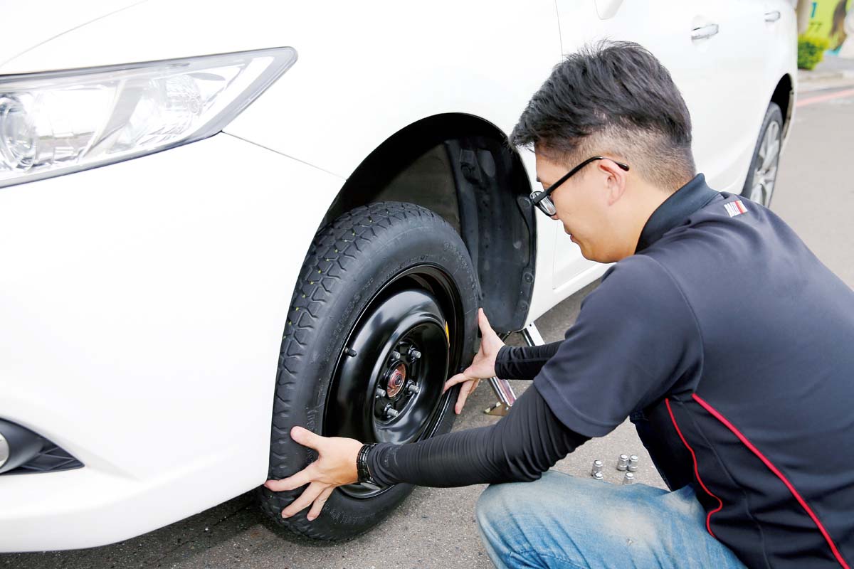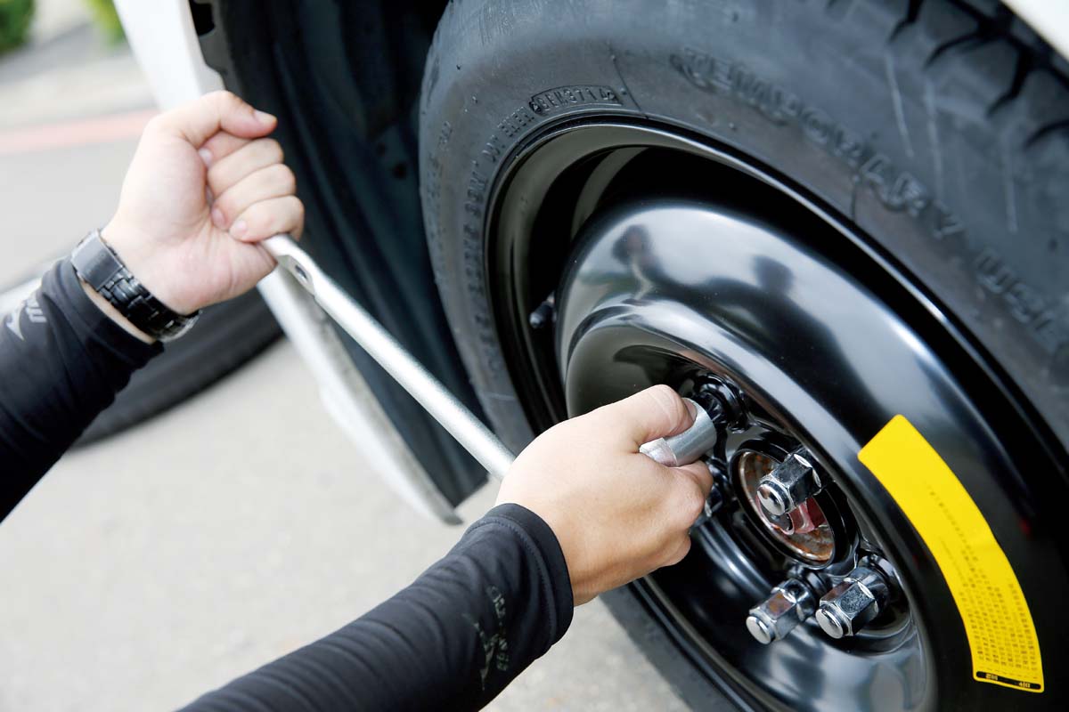 | 步驟5 將原有輪胎卸下裝上備胎,螺絲仍須依照對角線鎖緊,為確保螺絲有確實鎖緊,最後可用腳踩作為輔助。 |