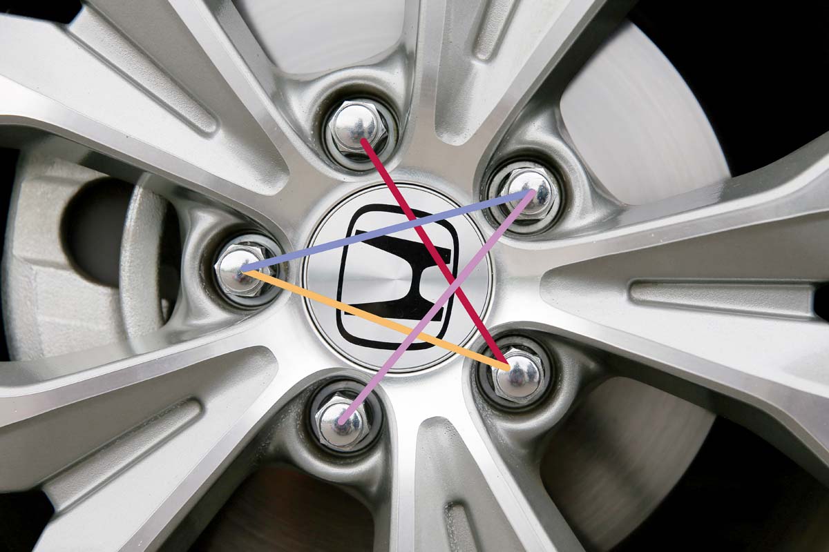 | 步驟3用隨車所附扳手工具鬆卸螺絲,由於輪圈螺絲並不容易鬆卸,因此可用腳作為輔助。 Tip:螺絲須依對角線依序卸下 |