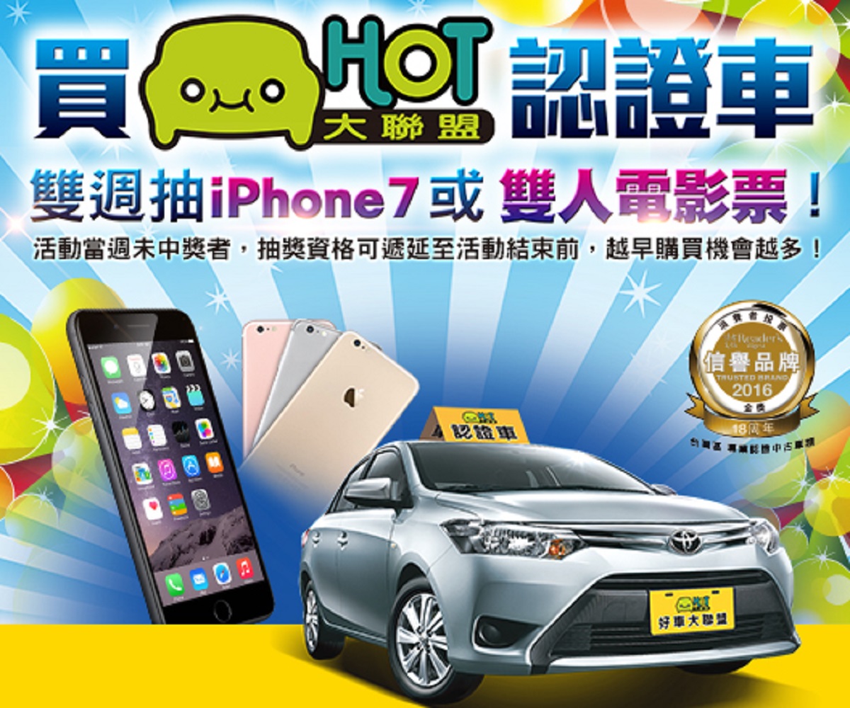 歲末成交HOT認證車雙週抽iPhone7 免費健診同步實施中