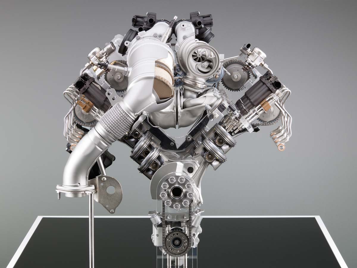 V型引擎係將複數的汽缸分成兩部份,並配置於曲軸的左右兩邊,並將汽缸排列方式呈現V型而得其名。V型式引擎可縮短因汽缸的增加而增加引擎長度,而分為左右兩邊配置的V型汽缸,會因汽缸數量的不同,而有60、90、120度三種常見的角度,角度方面不同的汽缸數採用的最佳角度也不同,V6引擎以60度夾角最優,V8則是90度比較好,這是從左右兩側汽缸動平衡角度來分析,可使引擎運轉平順,如果能增加汽缸數量,例如8缸以上,則怠速運轉更加平穩,怠速轉速甚至可降低到5、600rpm左右。