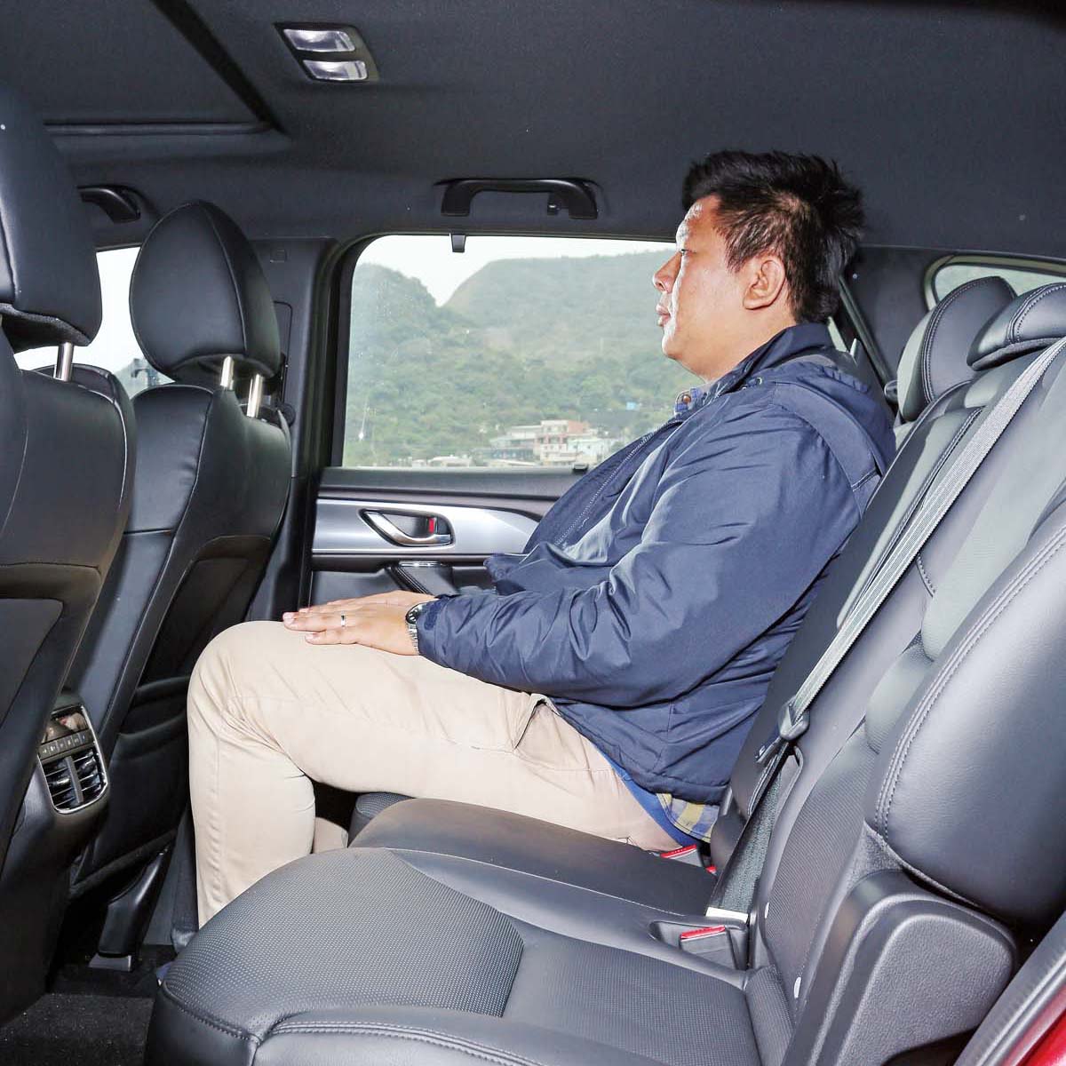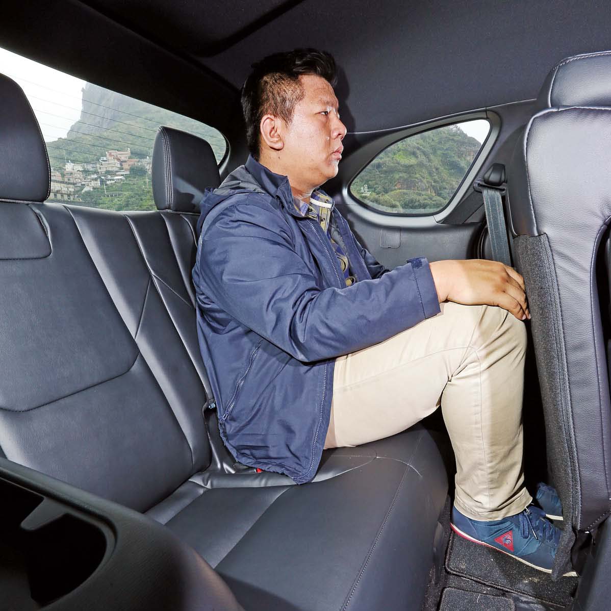 至於大家最在意的第三排座椅,絕對是筆者所坐過的5+2車型中,空間最為出色的前幾名,受惠於可前後滑移的第二 排座椅,讓二、三排的乘客都同時能享有到夠用的空間,而且原廠也特別將車頂挖出空間,即便筆者完全坐進車內, 也沒有頂著天花板的感覺,確實非常出色,其中最讓人滿意的便是第三排座椅雖然是二座設計,但仍然是為成人設計 的規格,不像許多5+2車型第三排只能用來乘坐小孩,令人讚賞。
