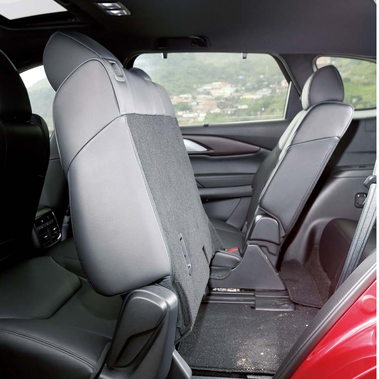 CX-9除了導入許多最新的科技及配備之外,它對於Mazda在車型定位上也是個全新的指標,在Mazda 5停產之後,該品 牌就沒有屬於自己的5+2座車型,CX-9則是目前Mazda對於5+2人座的全新定位,即使以往被視為「次等公民」的第 三排座椅,如今也能夠舒適自在,享受和前兩排乘客相同的乘坐感受。對於SUV而言,舒適的後座乘坐空間絕對是第 一要務,CX-9第二排座椅的空間非常充裕,2930mm的超長軸距讓它在腿部空間的延伸性非常好,座椅同時也具有6/4 分離傾倒、前後滑移、椅背調整等功能,另外在頭部空間的表現也是非常出色,以筆者183cm乘坐後仍有超過一個拳 頭的高度,完全沒有壓迫感,座椅的軟硬程度也算適中,唯一美中不足的是座椅寬度較為一般,不像是一部車型超過 5米的規格。