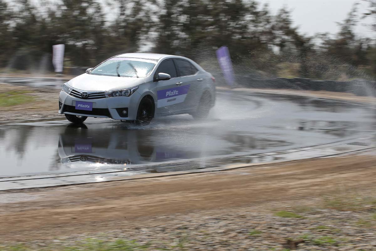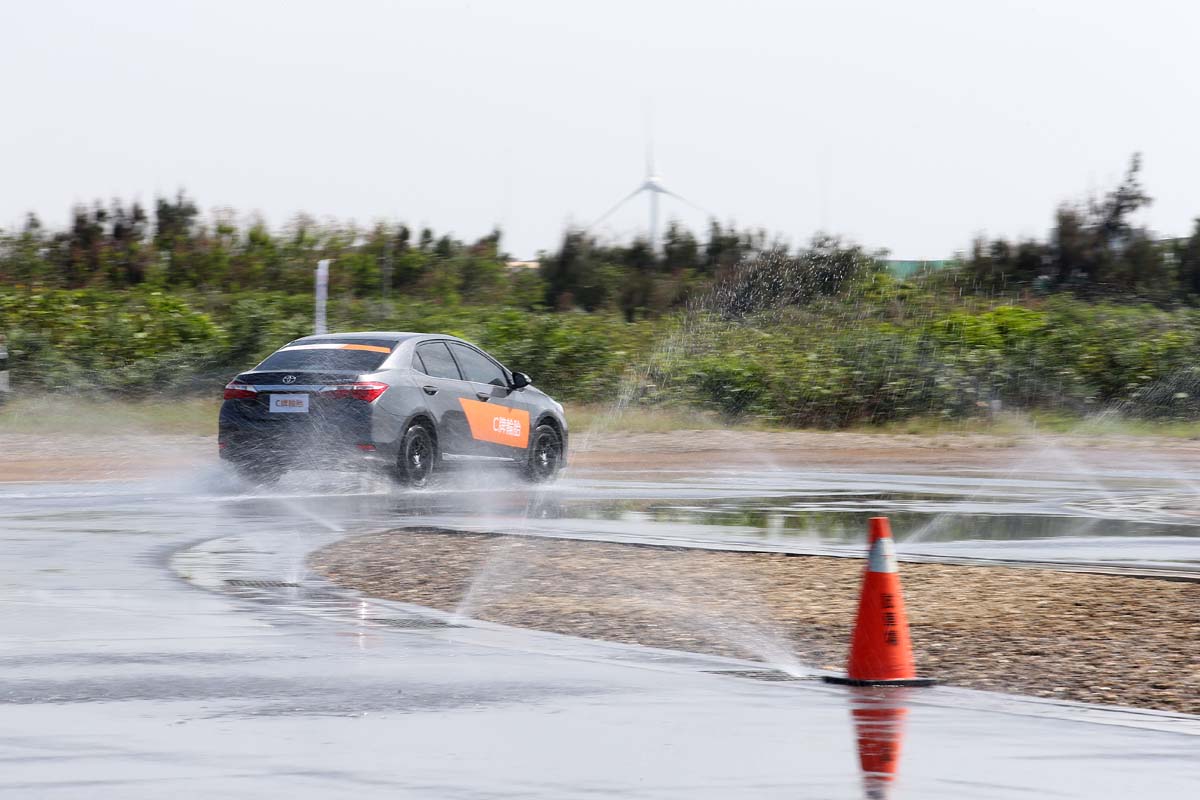 筆者上午首先體驗溼地繞周,這也是Playz主要的訴求項目,雖然工作人員規定彎中建議以某時速通過,不過說真的水狂噴加上要用到快速雨刷也沒時間去看時速表,只能看情況大腳油門及大腳煞車來體驗兩者不同,相同油門深度下Mectora 3開始偏移的區塊Playz則是相對安定,大腳煞車讓ABS做動區塊也明顯的縮短不少煞車距離。
