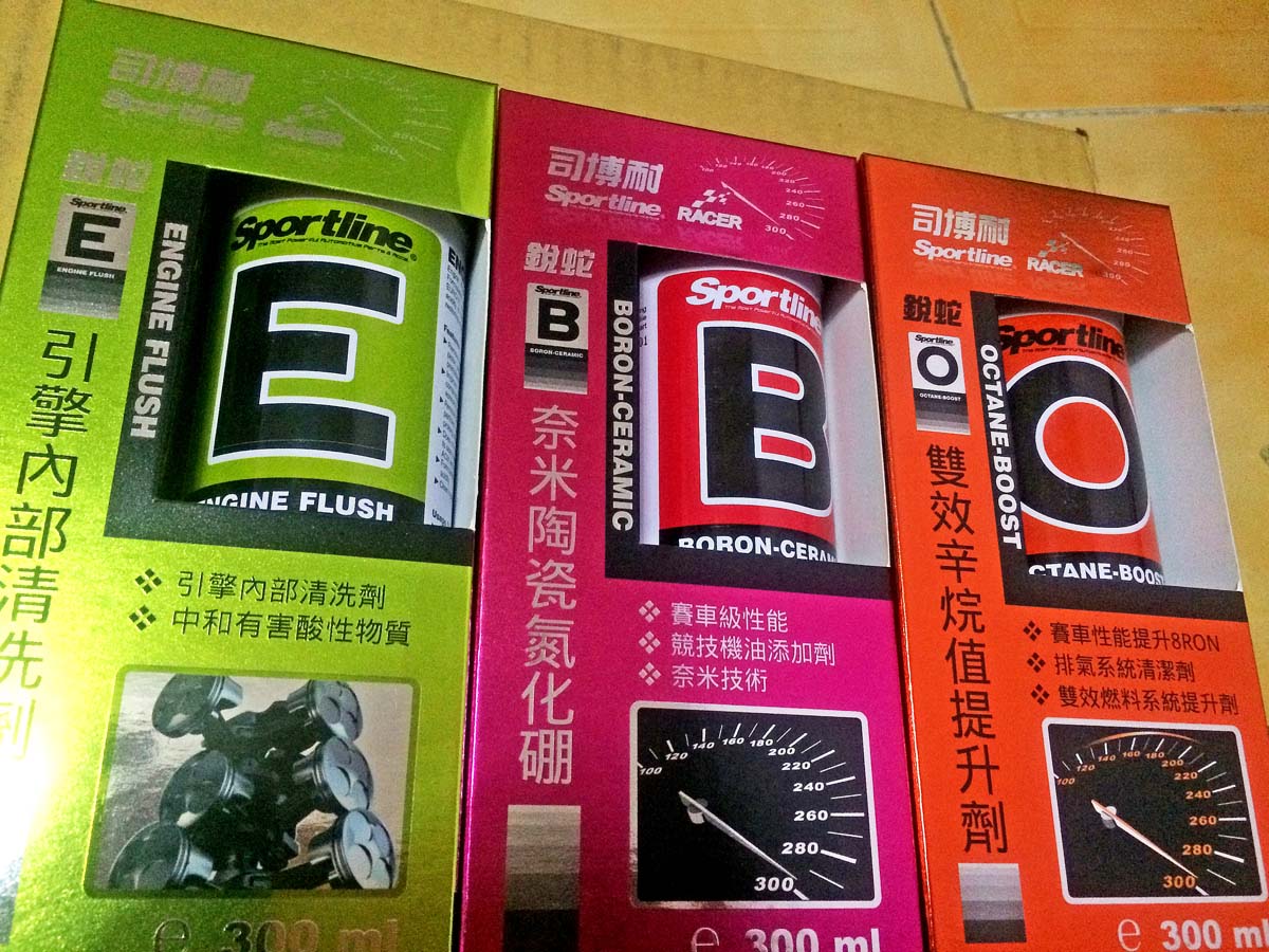 SPORTLINE-銳蛇300系列,包含了引擎內部清洗劑、奈米陶瓷氮化硼、雙效辛烷值提升劑,小弟之前有使用過司博耐液化鈦金屬還原劑和司博耐奈米燃油強化劑,在收到產品包裹後隔天打電話回原廠預約保養,車停好後先倒入引擎內部清洗劑,發動後轉速維持在1500pm,大約10分鐘後漏掉機油,順便換機油芯,再來加入奈米陶瓷氮化硼和機油後就完成,清潔後到現在油門回饋的確更輕盈,純市區表現約每公升達到8-9的實力,不知道這樣算不算優秀了!?