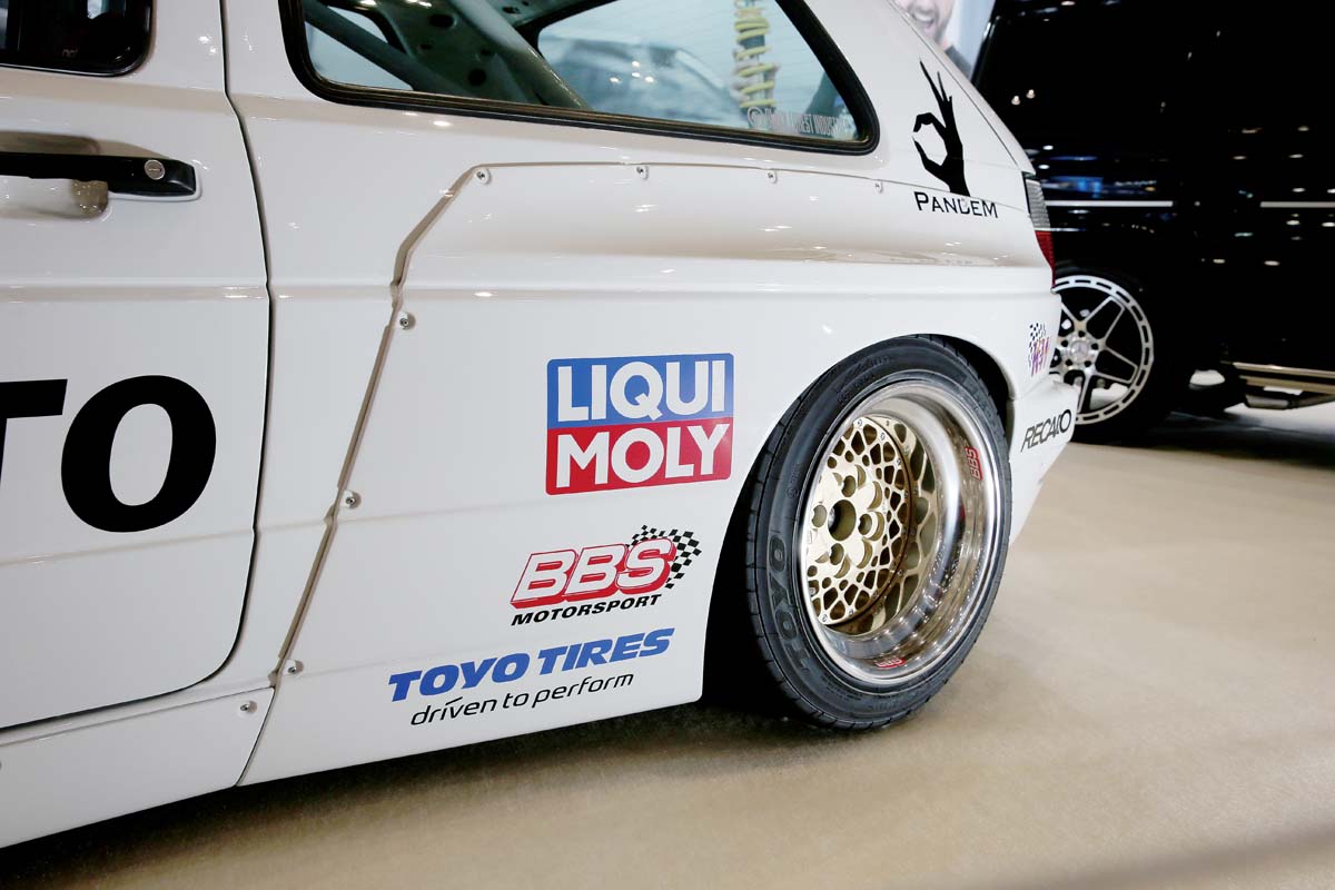 雖然真是不知道傳統日式爆龜的改裝風潮要流行多久,但有一點可以百分百確定的是只要車就能改裝,向來擅長打造前衛而獨特的Rocket Bunny再度以經典Golf作為操刀主力,即便車齡已高達30年之久的二代Golf,還是能夠藉由寬體外觀重生新氣息。可以看到前、後葉子板已經改為大面積的爆龜式樣,同時結合前、後保桿及側裙,延續車身線條卻又能夠凸顯壯碩的肌肉美感。而輪圈當然要選擇BBS復古款式,配合KW懸吊降低車身高度,就算是老車還是依然有魅力。
