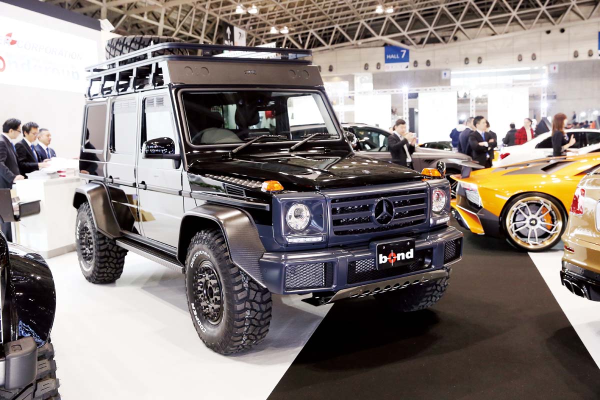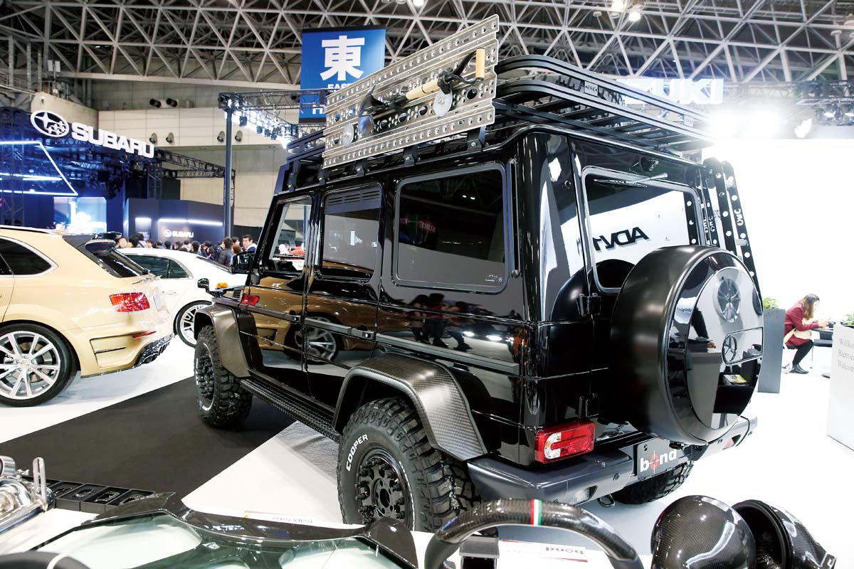 屬於超硬派風格的M.Benz G-Class,完全屬於越野領域的車輛設定本來就該到戶外翻山越嶺去,為了打造出更適合的改裝風格,日本改裝品牌Bond Tokyo特別推出看似粗曠卻又相當精緻的改裝套件,可以看到為了保護引擎在越野時能避免遭受地面撞擊,因此安裝具有通風孔的下護板,而原本四輪葉子板的爆龜造型也換上碳纖維材質,讓整輛車呈現高質感又偏向於性能化,不過為了能夠承載更多越野所需的重裝備,因此多功能車頂架不論是增加備胎或者鏟子都能輕鬆攜帶。