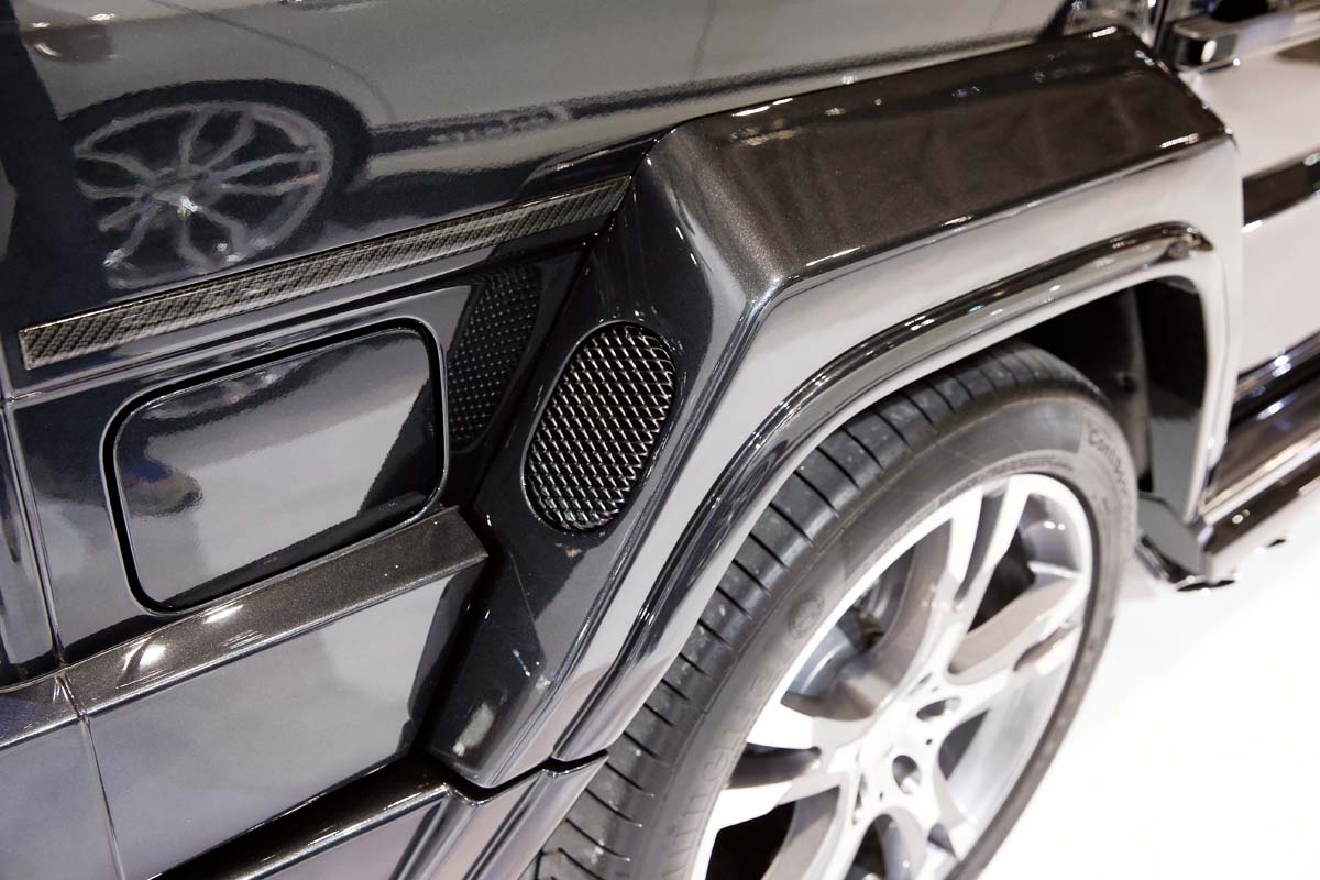說真的M.Benz G-Class雖然越野功能很強悍,但是有多少人真的會願意翻山越嶺越野趣,也正是因為看到多數車主的真實需求又希望能有獨特性,因此Lorinser針對G-Class才會推出兼具越野粗曠,但又不失高質感的外觀套件,首先大燈裝上防撞護網看起來有模有樣,而前保桿下方所增加的護板式樣,採用金屬髮絲紋的設計看起來應該好看大於實際的防護功能。車側方面並沒有太多變化性,僅僅以碳纖維飾板稍微修飾車身腰線,後葉子板則追加氣流導孔作為裝飾使用。