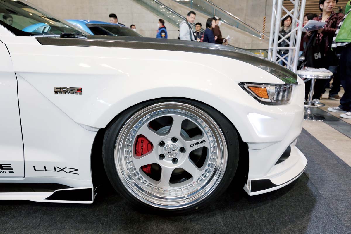 向來採用粗曠外放的美系野馬,長久以來就是美國平價跑車的代名詞,但是在日本改裝品牌EDGE CUSTOMS的眼裡卻有不同設計概念,雖然野馬的外型很狂野,但是透過空力外觀的改裝也能夠在外放的同時保有精緻美感,因此可以看到從車頭開始有了轉變,額外加裝的前下擾流與水箱護罩開始有了改變,碳纖維引擎蓋的氣流導孔則能加速引擎室熱氣排出,雖然野馬的車側線條已經相當立體,但EDGE CUSTOMS仍透過寬體葉子板強化武裝,而車尾的翹鴨尾則與後下擾流相呼應。