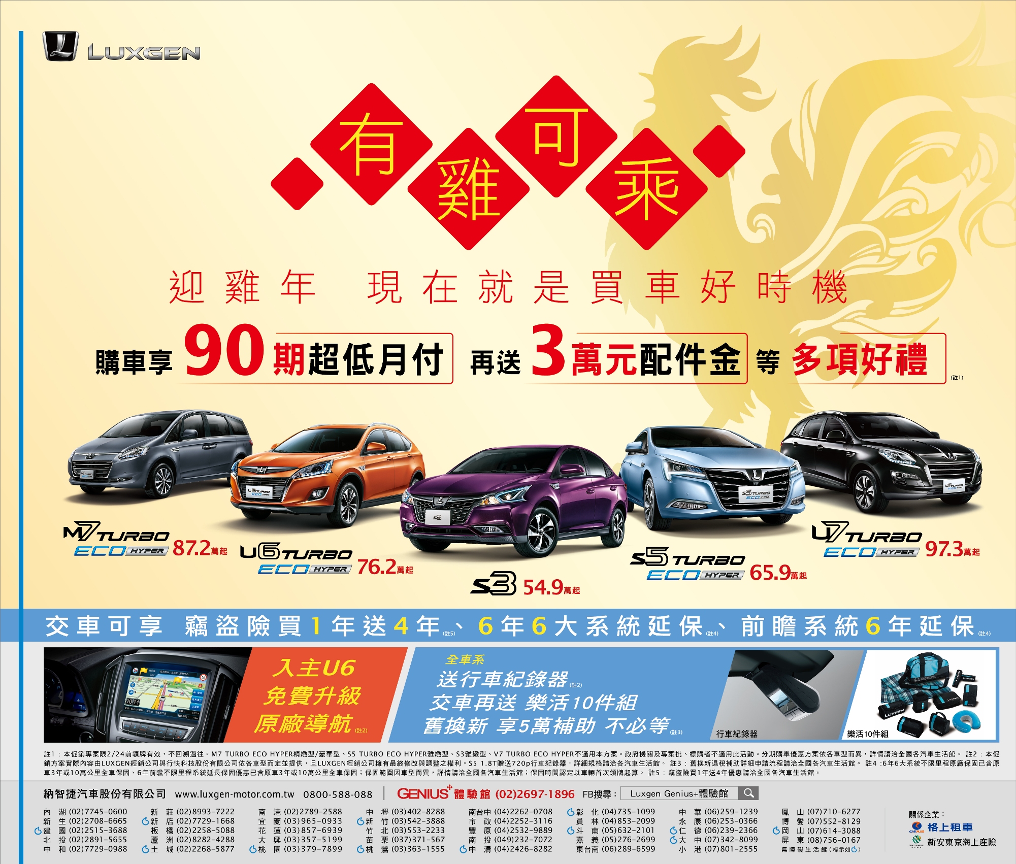 台灣唯一自主品牌LUXGEN因應年節到來並感謝所有消費者的熱情支持與肯定,特別推出「有雞可乘」購車優惠專案,讓您迎向嶄新一年的同時,都能夠輕鬆買車過好年!現在入主LUXGEN全車系立即享有「有雞可乘」購車專案(1):最高可享90期低頭款低月付分期專案,或選擇最低日付30元起(首年)「30而立」專案優惠,同時享:3萬元配件金、行車紀錄器(2)、舊車換新5萬補助不必等(3),交車再送樂活十件組(4)、 6年6大系統不限里程延長保固、6年前瞻系統不限里程延長保固(5)、竊盜險買1年送4年(6)等全方位行車保障。歡迎喜愛LUXGEN的準車主們敬請把握二月底前新春入主好時機。