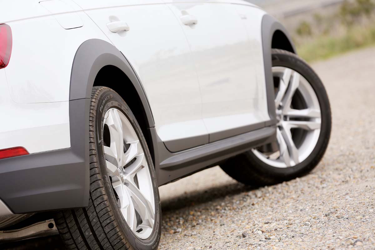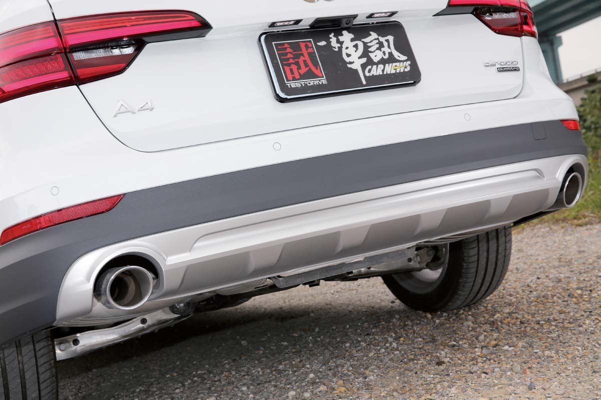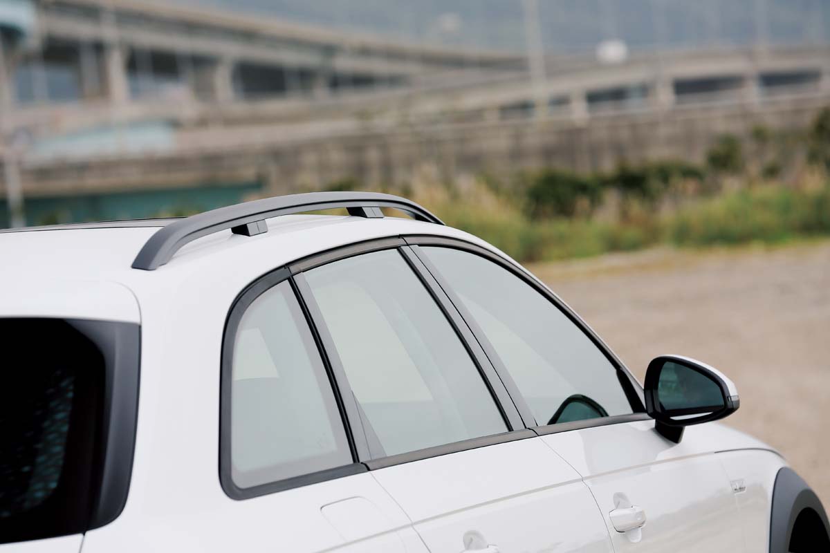 單就A4 allroad quattro的外觀來看,它確實就是部A4 Avant的加高版本,行程更長的懸吊系統搭配在SUV上常見的車身下緣黑色防撞塑料,替本來極具都會氣息的樣貌增添了許多粗曠越野的風味,車頭上顯眼的六角盾型水箱護罩也從原先A4 Avant上的橫柵式改為直欄式樣,前保桿到側裙都是allroad quattro的專屬設計,值得注意的是本次試駕的車型為16/17年式車款,未來交車時的車型將會標配高光澤套件的正17/17年式,包含車頂置物架、車窗外框都會改為電鍍鋁材質,B柱及後窗三角飾板則會變成高亮度的黑色,側裙也由原來的黑色飾條改為鍍鉻材質,外觀風格看來將會更加豪華。