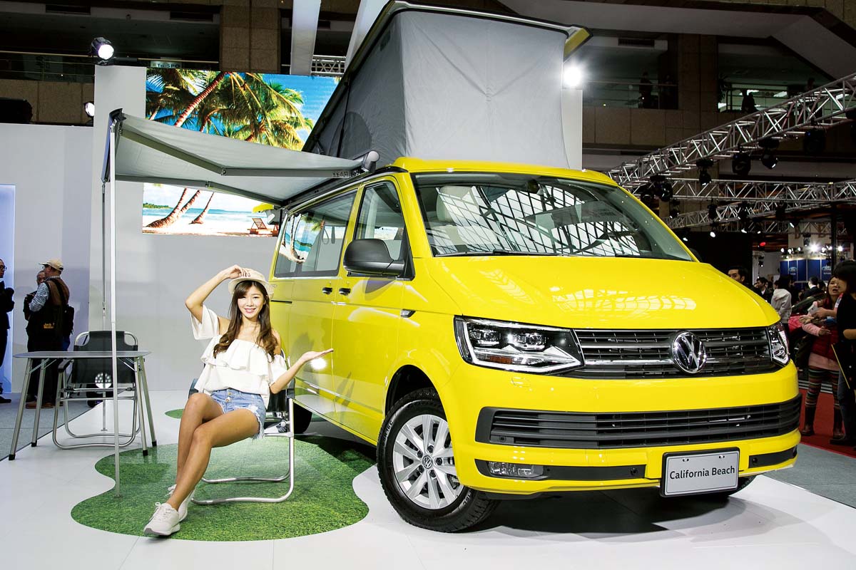 在露營領域具有一席地位的VW California,於本屆車展也替露營玩家帶來限量75部的T6 California Beach。T6 California Beach為免除買家露營時搭帳篷所花費的精力,車頂配置手動升降車頂帳篷,僅需推開駕駛艙車頂便立即變身成雙人床位,而座艙附可拆式無段式滑軌系統,可將座椅折疊後變成長2公尺、寬1.5公尺的臥艙。同時,更配置伸縮車邊帳與多功能折疊桌椅,大幅減少物品攜帶與搭篷時間,同時亦附有外接充電接頭,以滿足露營時所需各項電器用品。
