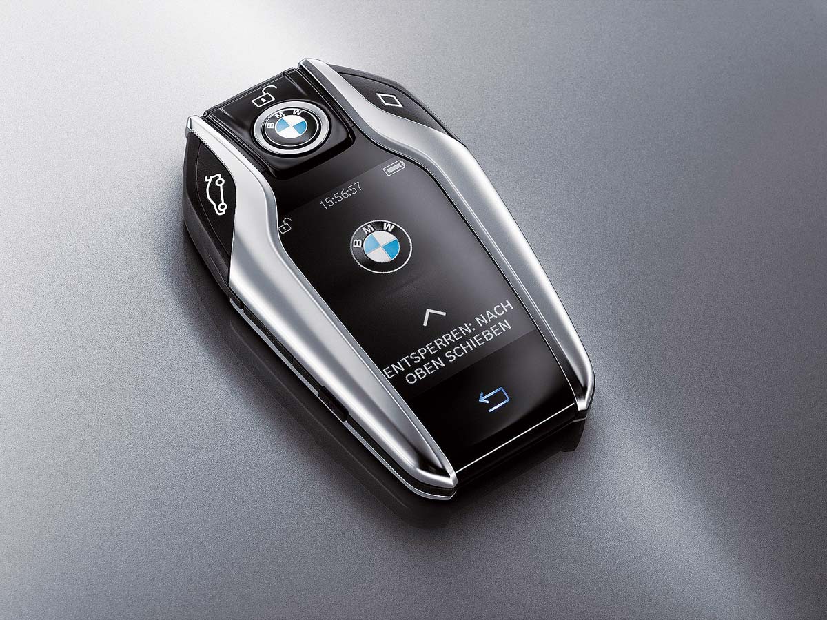 根據維基百科解釋,鑰匙是一種「與鎖對應,用以開鎖」的工具,而於汽車之上則多了啟動引擎的功能,在最新的BMW 7 Series以及5 Series之上,這種工具從此有了全新定義,因為這兩款車的新鑰匙其實有著更接近智慧型手機的樣貌,小巧精緻的造型設計下,配有一具解析度美好的觸控式螢幕,上頭不僅可顯示多樣化的車輛相關資訊包括時間、剩餘油量、目前可行駛里程以及保養通知,同時也提供中控鎖、車窗及玻璃天窗啟閉的當前狀態供查詢,甚至還可透過觸控螢幕控制部分功能的作動,像是剛才提及的門鎖、車窗或天窗,甚至是車內空調也可預先以智慧型觸控鑰匙開啟以降低車室溫度,就連無人駕駛遙控停車功能,也能在這個超炫且精緻的小小控制介面中完成,大大滿足科技控的虛榮心。