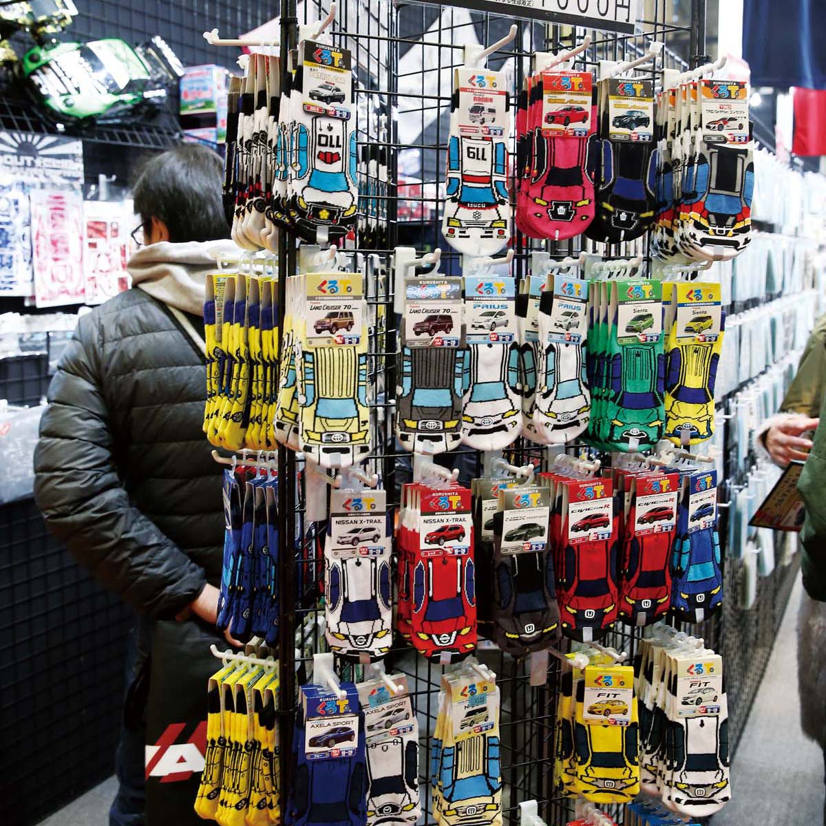 TAS車內當然就是集結了愛車人士,及各種玲瑯滿目關於汽車的商品,像是這一攤內以汽車為設計的襪子,3雙1000日幣大約台幣300元左右的價格,到了最後一天展覽幾乎已經被掃個精光。