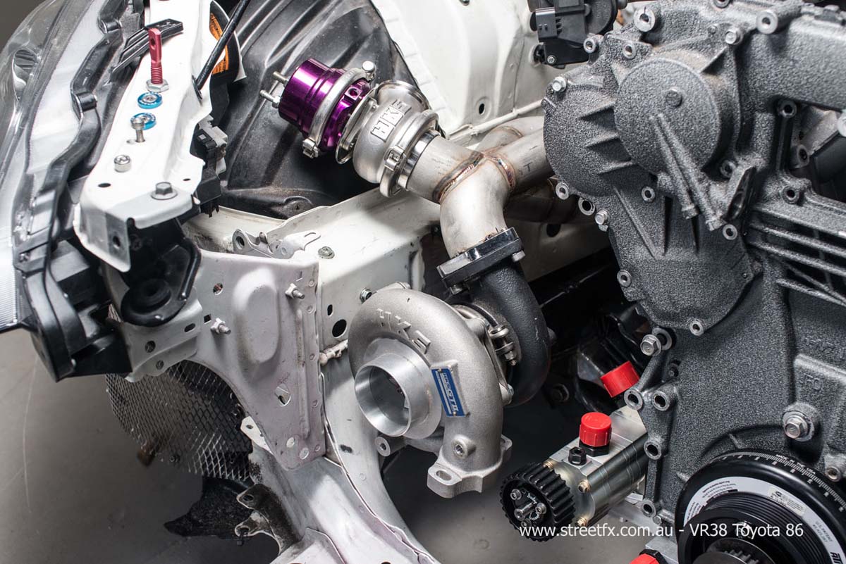 StreetFX Motorsport與GT Auto Garage共同打造的86,這次將目標放在1000hp以上的動力,最終目標希望打造一輛可在賽道與一般道路走行的車輛。不過這個企劃最早其實不是以VR38為目標,86原廠引擎如果施以強化渦輪增壓,最大動力約可能有545hp以上的實力,不過這樣大幅提升動力下,則是很有可能在各個部位產生問題,因此最後將方向放到R35 GTR上的VR38,既然如此500-600hp的出力就不會是目標,GT Auto Garage的要求下,VR38腹內全數更換上HKS 4.1kit鍛造強化品,並且搭配HKS GT1000的渦輪增壓套件,目標鎖定1000hp OVER!!