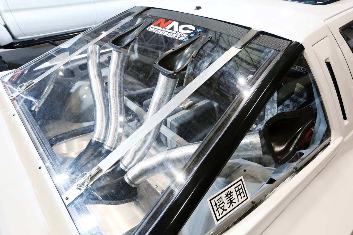 日本的自動車學校不算少數,正是日本汽車工業發達的主因,並且國內賽事制度相當完善,工匠技巧也都能在這裡傳承且淬鍊,而學校也都會提供實戰經驗給學生,這輛中日本自動車短期大學所打造的NAC Starion Spec-D,正是學生們投入D1 GP甩尾賽的作品,採用三菱Starion為基礎,並且把引擎傳動等套件全數更換,目前已經將RB26DETT順利植入,且換上RB25的五速手排變速箱,動力部分預計將排氣量提升至2.8升,希望有600hp左右的出力,外觀上則為了容納更大的輪胎,學生們也自行手工打造四輪寬體車身。