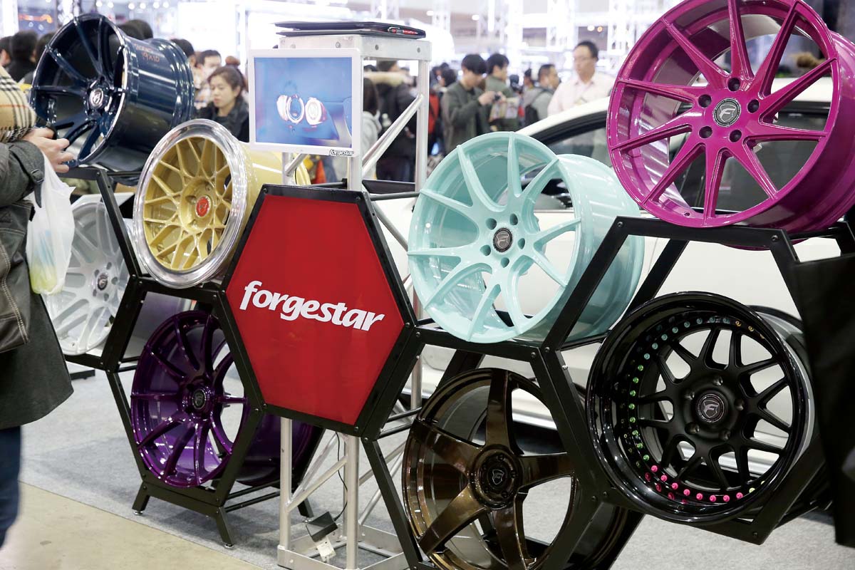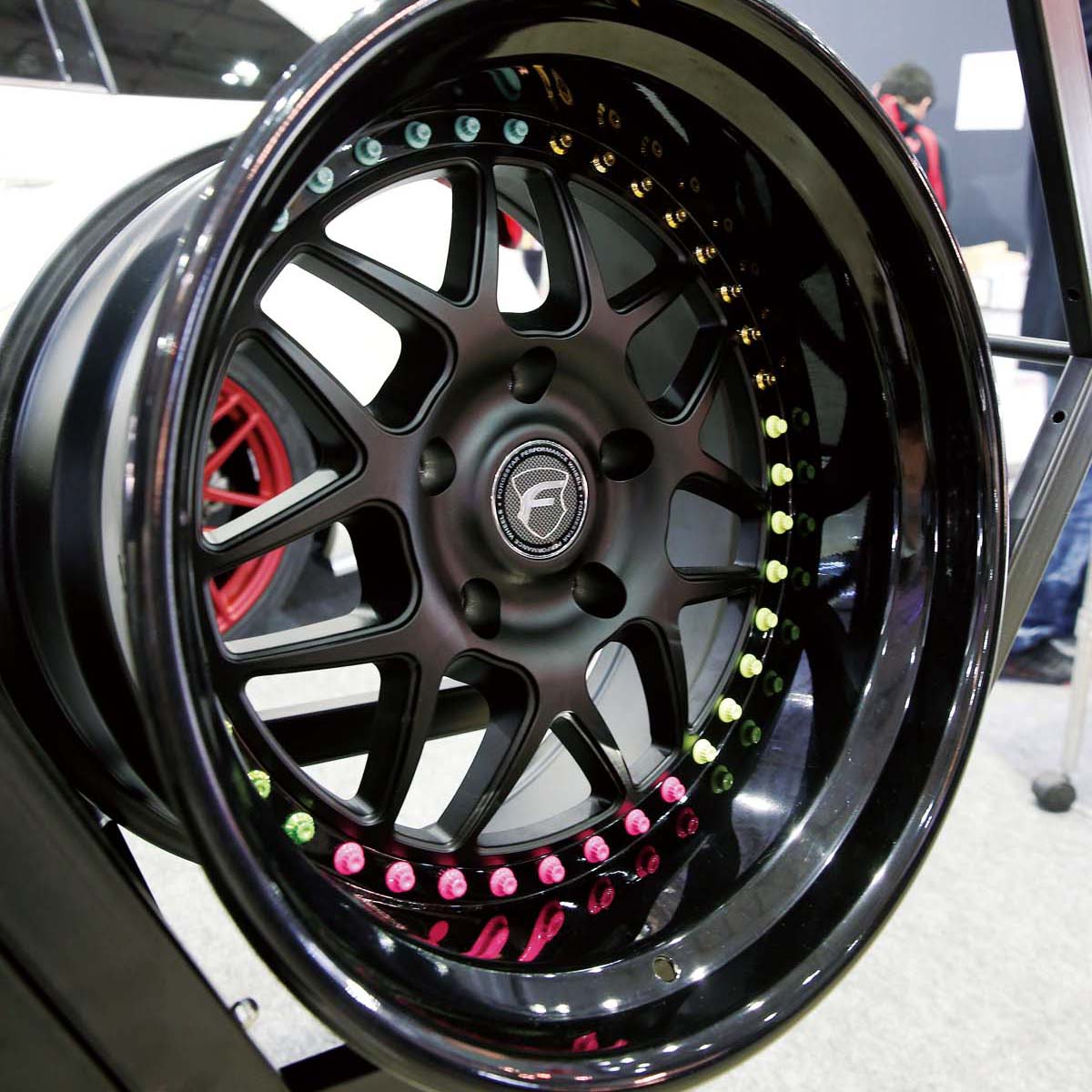 來自於美國Forgestar,滿滿的美式風格就是要大咖,旗下最小的尺寸居然是從19吋起跳,會場內的輪框就是大尺寸、大J數及小ET,搭配特殊的塗裝配色就是騷包,雙片式還可選擇不同色澤的陽極CNC螺絲。