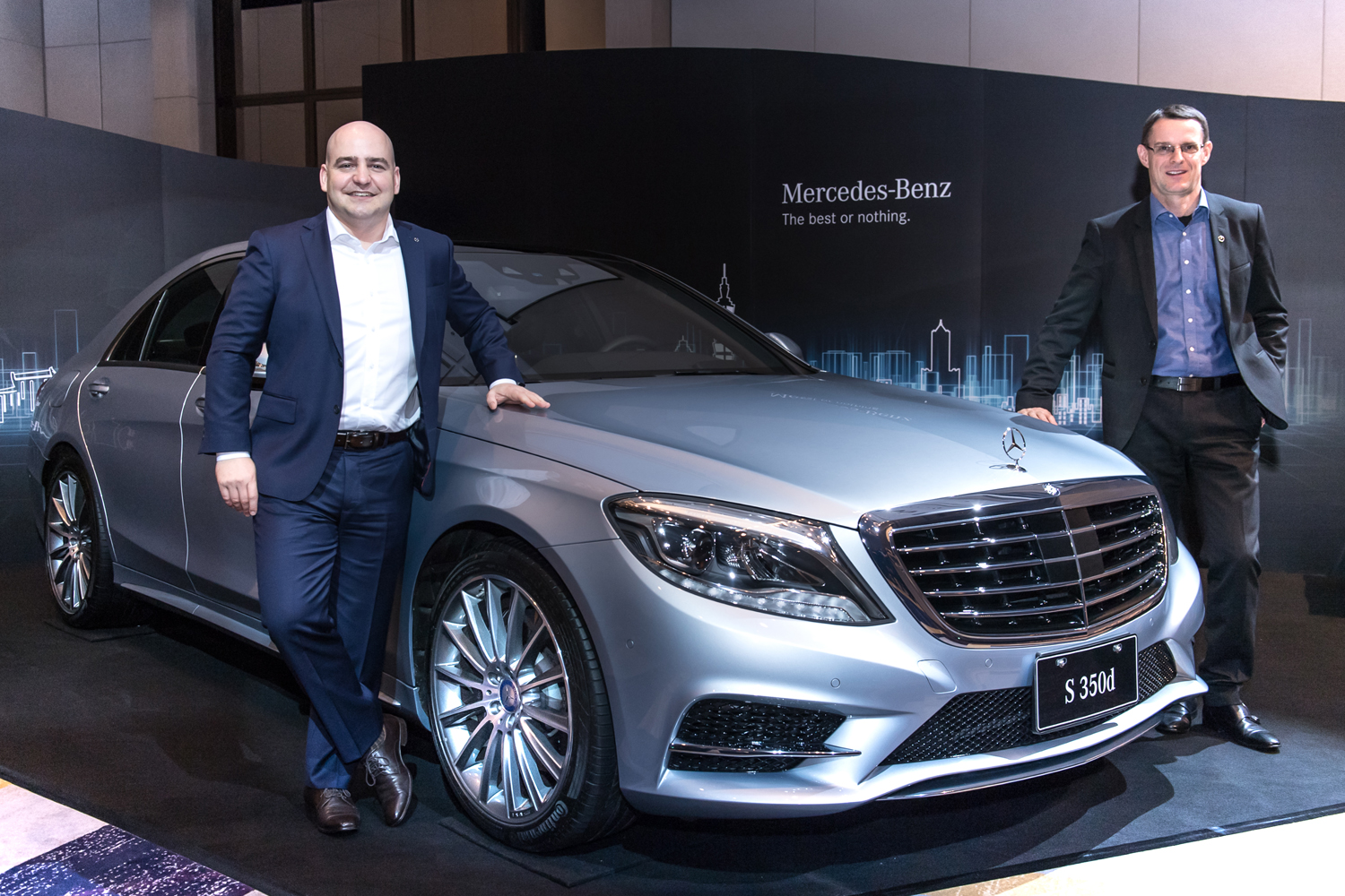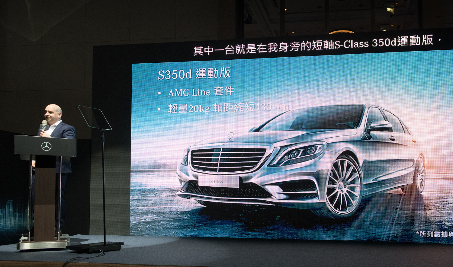| 台灣賓士總裁邁爾肯先生(右)與台灣賓士轎車行銷業務處副總裁何睿思(左)與短軸的S350d運動版合影。 |