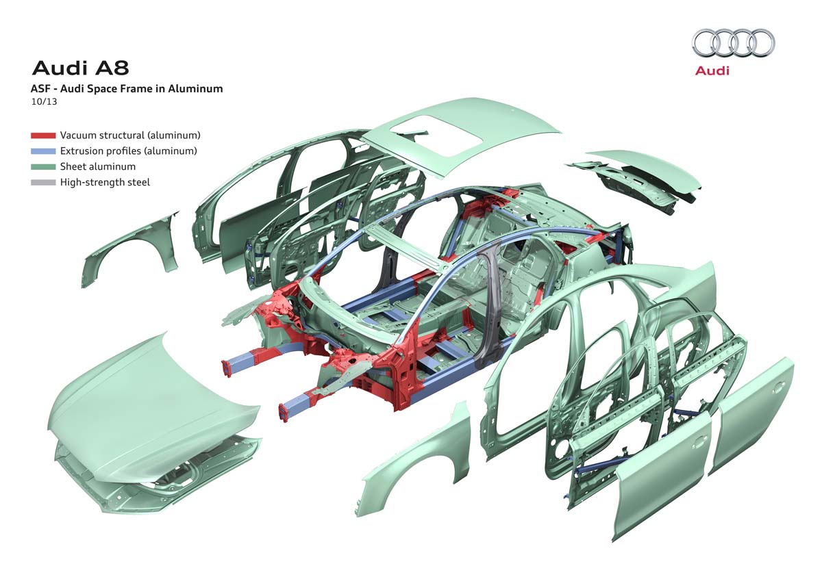 極為大膽性的突破創舉,不僅讓Audi在1994年發表了全球第一款鋁合金高剛性車身結構的量產車第1代Audi A8,同時面對同級的競爭對手更能減少100~150kg的重量有助於油耗降低,而車體剛性也提高60%,雖然截至今日仍只有少數豪華房車採用全鋁合金的車體結構,不過許多車廠紛紛改以鋁合金材質取代部分底盤機件以減輕重量。甚至在後來的應用材料學進化之下,配合結構補強技術的進步,透過不同材質的鋼材來達成輕量化與高剛性的車體目標。