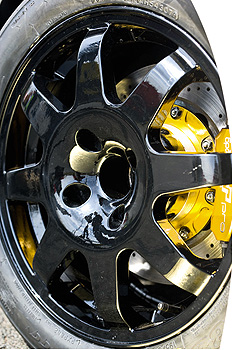 讓這些高抓地力的配備牢牢黏在柏油路面上的,是Koni Development圈簧、並結合一支OMP拉桿;而引擎蓋底下既然擁有這麼多的充足馬力,好的煞車也是必要的,Tony選擇了WP Pro 305mm碟盤、並整合大型的六活塞金色卡鉗。