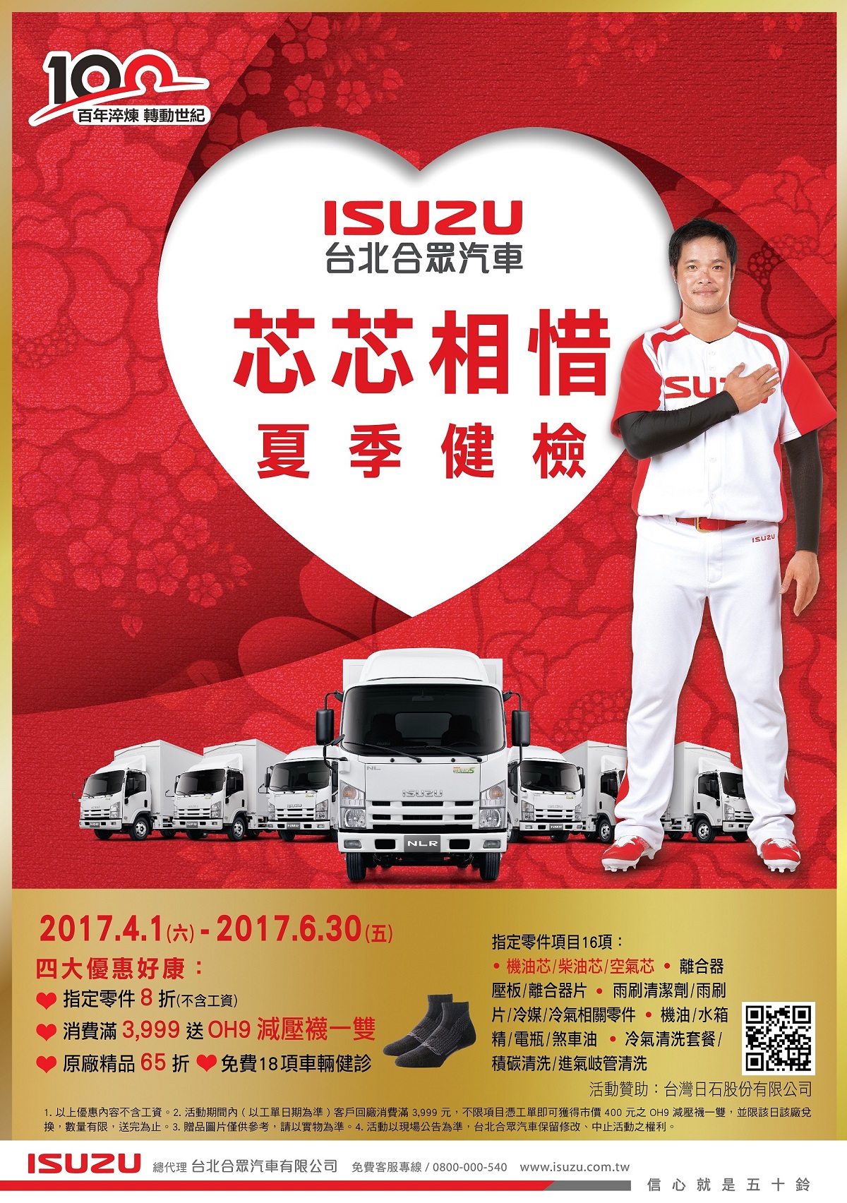 4/1(六)開始起跑的ISUZU芯芯相惜-夏季健檢,優惠零件包含機油芯、柴油芯、空氣芯…等多達16項,讓頭家們不需再三心二意,活動期間內共有四大優惠好康內容:指定零件8折優惠(不含工資)、消費滿3,999送OH9減壓襪一雙、原廠精品65折以及免費18項車輛健診,滿滿誠意的內容歡迎各位頭家們趕快開著愛車到ISUZU報到,為接下來的酷夏季節提早做準備。