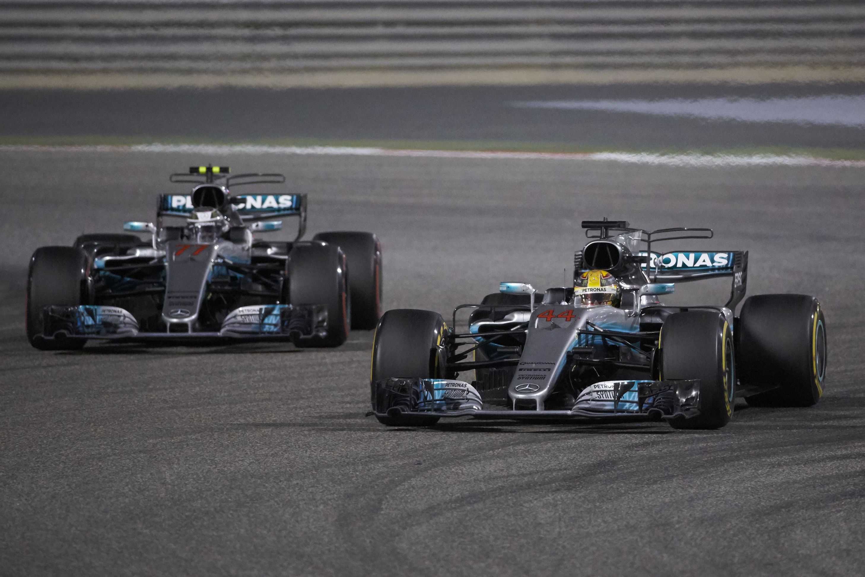 4月16日準時起跑的巴林站正賽,一開始Valtteri Bottas起跑表現平穩,順利取得領跑姿態,而隊友Lewis Hamilton則因受限Scuderia Ferrari車隊的Sebastian Vettel外側起跑優勢而落居第三,不過Sebastian Vettel卻早早於第十圈就先進站換胎,Red Bull Racing車隊的Max Verstappen也積極跟進,正當大家還在臆測此策略用意之際,第12圈時由於Toro Rosso車隊的Carlos Sainz與Williams Mercedes車隊的 Lance Stroll的碰撞意外帶出了Safety Car,逼使著Mercedes-AMG Petronas Motorsport車隊兩車手趕緊把握時間進站換胎,這突如其來的動作讓Mercedes-AMG Petronas Motorsport車隊措手不及,更讓後方進場的Lewis Hamilton因等待隊友換胎而於進站時速度過慢,被大會判罰刻意阻擋而罰時五秒,為之後的賽事變化種下變因。