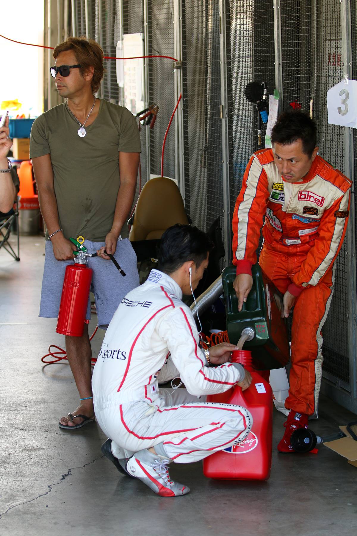 | 手持滅火器的工作人員確實待命後,加油的工作人員才能開始加油,此時接觸車輛的工作人員都必須身穿賽車服、賽車手套、賽車鞋與防火面罩。 |