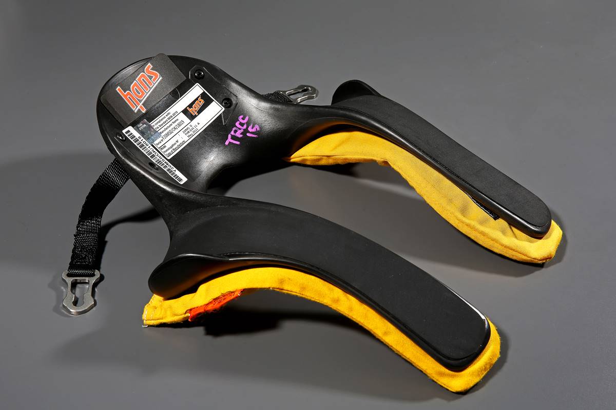 | 當車輛在50km/h發生正面撞擊時,瞬間所產生的G力至少超過10G,為了確保頸部不會過度擺動而造成嚴重傷害,必須要靠HANS (頭部支撐系統)來減緩衝擊。 |