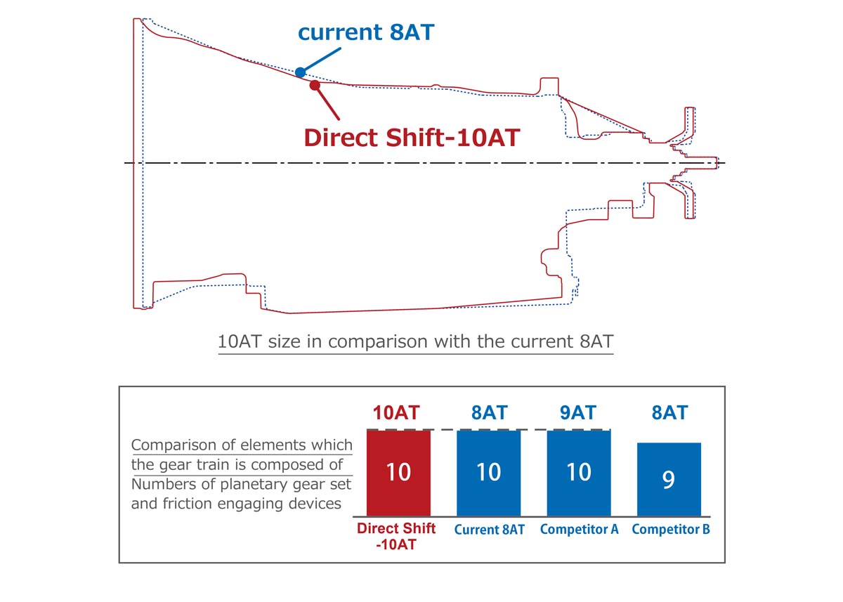 第二是隨著合金材料技術與加工工藝的進步,變速箱內的行星齒輪組與多片離合器在保證強度和耐久性的前提下可以做得更小更輕,這使得檔位數目提昇所導致的體積與重量負面影響被有效抑制。Aisin與GM的10速變速箱甚至只使用與9速變速箱相同的4組行星齒輪(但排列與構造改變)。如此一來檔位增加的優勢更為突出:液力式自動變速箱的平順性並非由檔位數決定,更多的是與換檔邏輯的設置以及扭力轉換器的調校有關,更多檔位帶來的直接優勢是擴大變速箱的變速範圍,這可實現提昇低檔位的扭矩輸出(車輛提速更快)及降低高速巡航時的轉速(提昇車輛燃油經濟性),更多檔位也有利增加扭力轉換器總成內部離合器鎖止範圍,在更低的車速下就讓引擎與變速箱實現硬連接、提昇傳動效率,對燃油經濟性有更大助益。我們可以說液力式自動變速系統的進步代表了汽車傳動技術發展又上了一層台階。