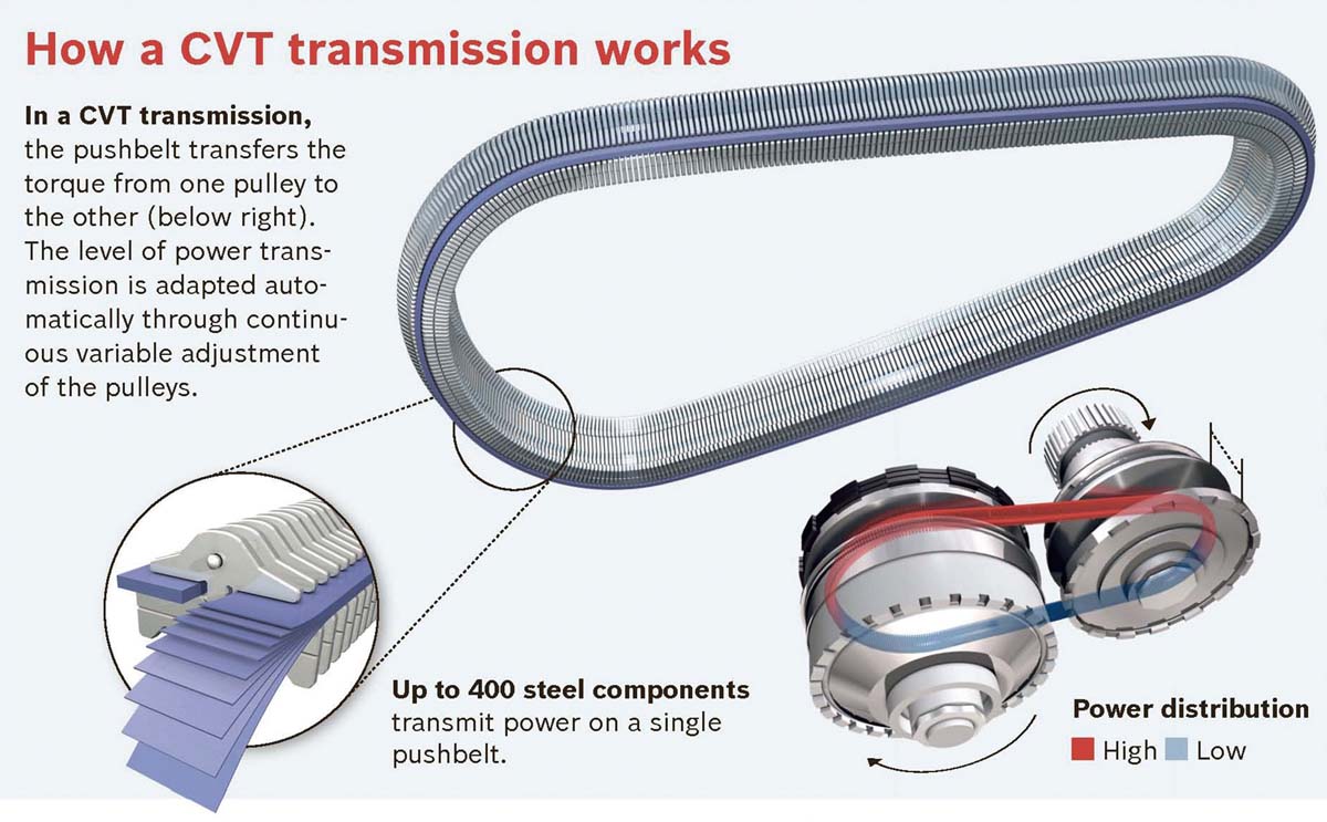 相較於DSG與液力式自動變速的快速進步,可能有讀者認為CVT(Continuously Variable Transmission)無段變速系統並不值得一提!然而在複合材料與電子控制技術的幫助之下,今日的CVT變速箱性能已不可同日而語。有人認為使用DSG變速箱的車輛性能更為優異,其實這並非事實:因為F1賽車也曾試用過CVT變速箱。F1工程師眼中的理想世界,就是讓引擎能夠在最長的時間以最佳效率(可能是最大扭力或最大馬力狀態)運作,但這個目標在傳統的變速箱設計上因為受限於齒輪組的數目限制而困難重重、唯一有可能實現這個夢想的變速箱設計原理就是CVT無段變速系統。