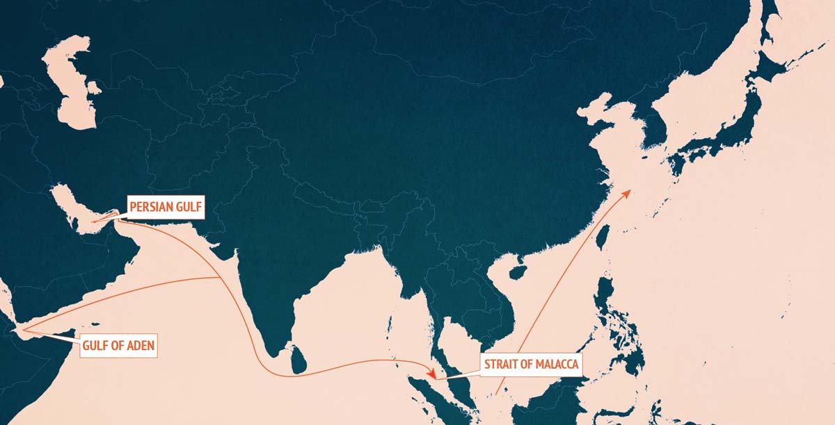 在沙地阿拉伯開採完石油後,從波斯灣出發,沿海經過印度洋,當要穿越馬六甲海峽時,因海峽很窄,加上此地是通往太平洋的最短航線,海面上會非常擁擠,海盜也相當猖獗。很多油輪都會以馬六甲海峽為中途站作補給,再北上南海並通往東亞地區。