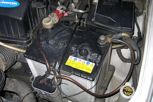 在Option編輯通知我抽中試用品後幾天,便接到了萊司龍張先生打來的電話?,並告知會南下親自幫我處理,到了約定的時間,先發動車子以怠速運轉後,只見張先生熟練的旋開電瓶加水孔蓋,並專業的以量杯計算,將還原液依建議比例倒入,然後就開始跟張先生聊天,聊著聊著電瓶竟產生了變化,內部液體部分開始產生泡沫,張先生說這是在進行還原的化學反應,並說我車子的電瓶狀況不錯,因為白色泡沫生成不多,過了15分鐘張先生就說OK了並請我試開看看。