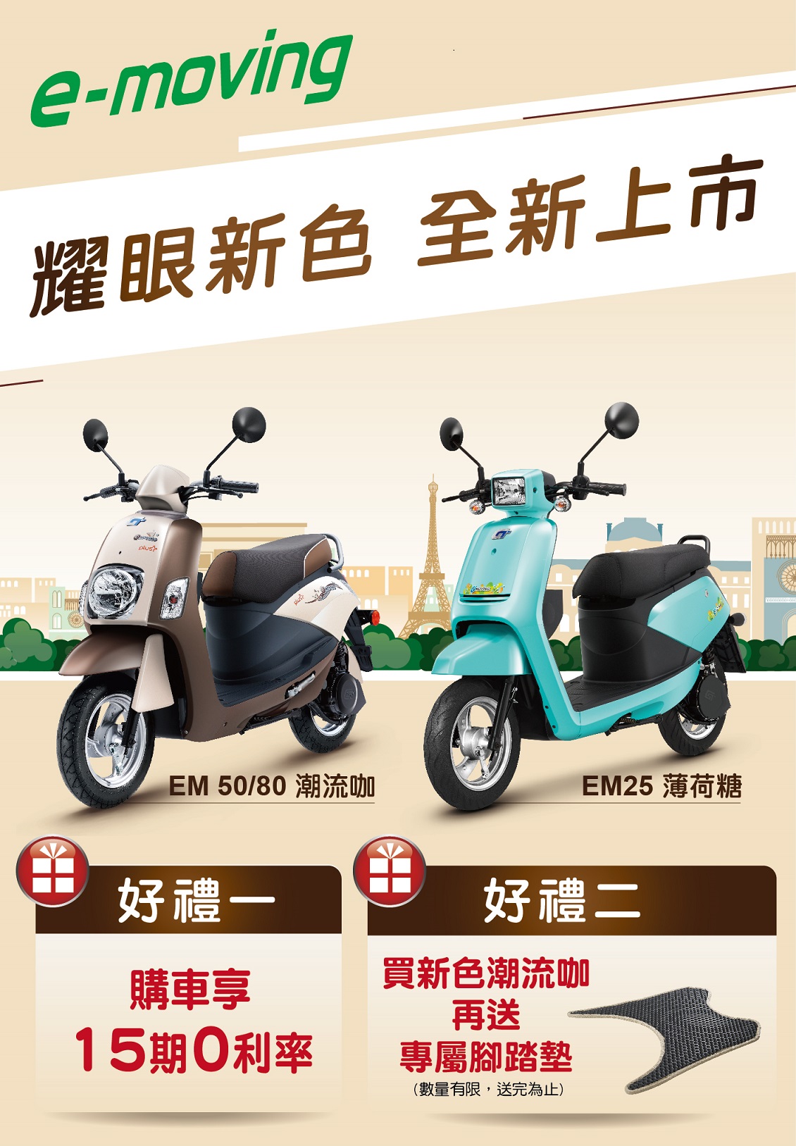 中華電動二輪車推行環保推動低碳生活不遺餘力,為了讓消費者有時尚且多元選擇,即日起推出全新車色,e-moving 50/80推出潮流度滿分咖啡色,e-moving 25則結合環保節能的指標趨勢,並以今年春夏最流行的薄荷綠來作為設計方向推出翠綠色。在此同時,中華汽車同步推出享15期0利率購車優惠外,入主e-moving 50/80咖啡新色再加贈送限量高級專屬腳踏墊,好禮優惠加碼大放送購車趁現在。