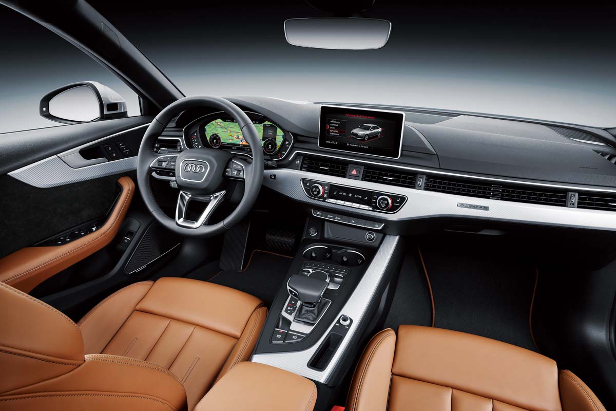 Audi向來給人濃厚的科技感,在現行A4上導入了全新的數位虛擬座艙,儀錶板採12.3吋全智能液晶螢幕,可切換車速/引擎轉速、導航地圖、音響/媒體資訊、駕駛輔助系統等功能,所有資訊都可以一目了然的判讀;同時亦配置了全新一代的MMI navigation plus 多媒體系統,具備8.3吋高解析彩色顯示幕,搭配MMI touch觸控手寫板,能以更直覺化的方式操作多媒體功能,並且也具備完整地智慧型手機連結功能,可與智慧型手機做連結,演深出更多的數位與影音功能。